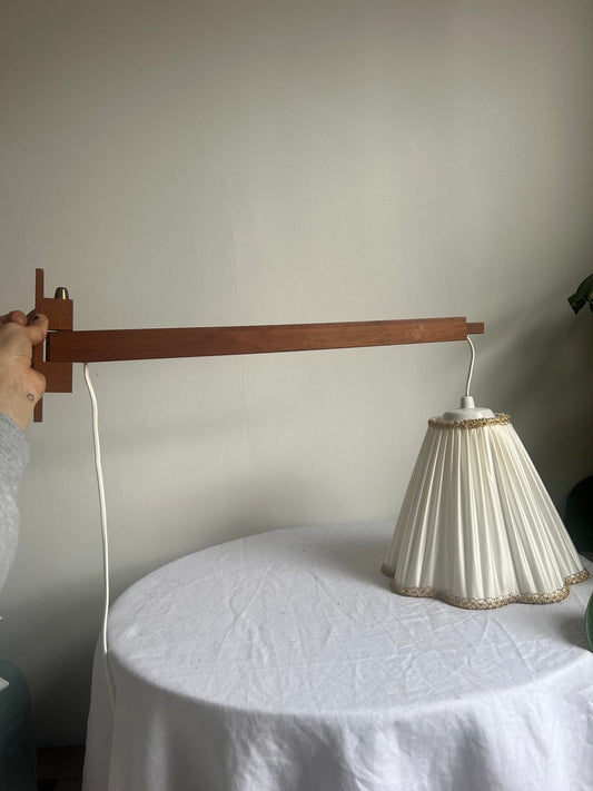 Mid Century teak scissor wall lamp with large chrome metal shade