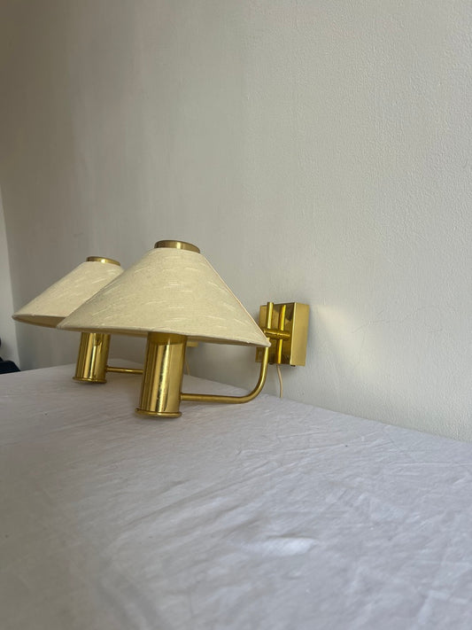 Pair of brass wall lights with linen cone shades