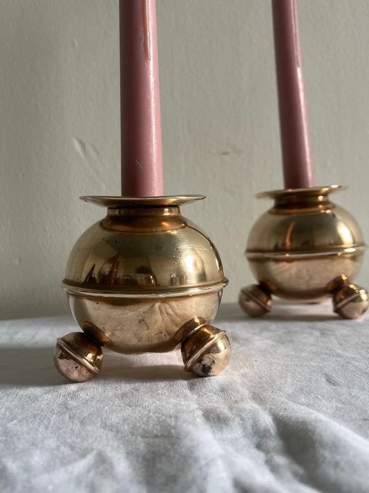 Sold outPAIR OF BRASS SPHERE CANDLE HOLDERS