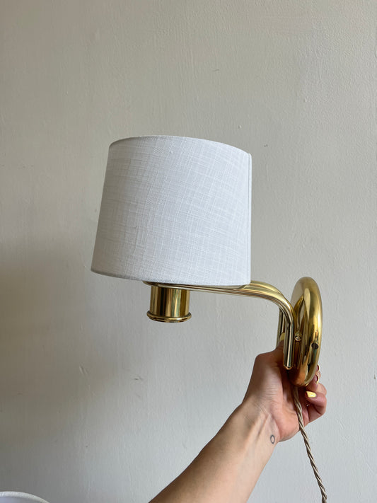 PAIR OF BRASS WALL LIGHTS WITH LINEN SHADES