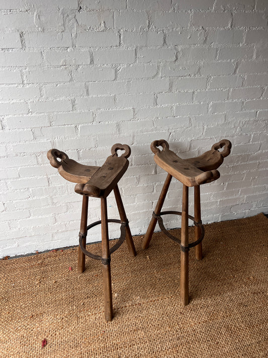PAIR OF BRUTALIST SADDLE WOODEN STOOLS