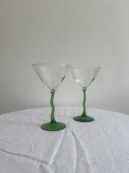 Pair of green wiggle stem cocktail glasses