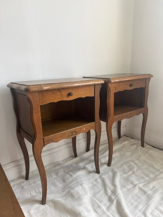 Pair of French matching oak bedside tables with drawers