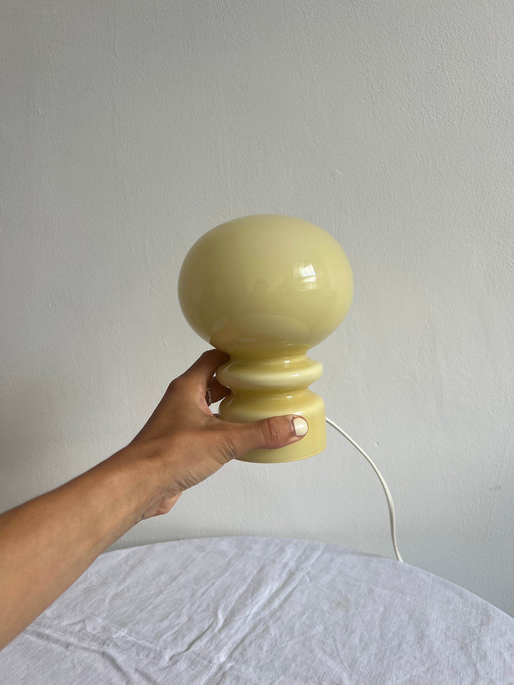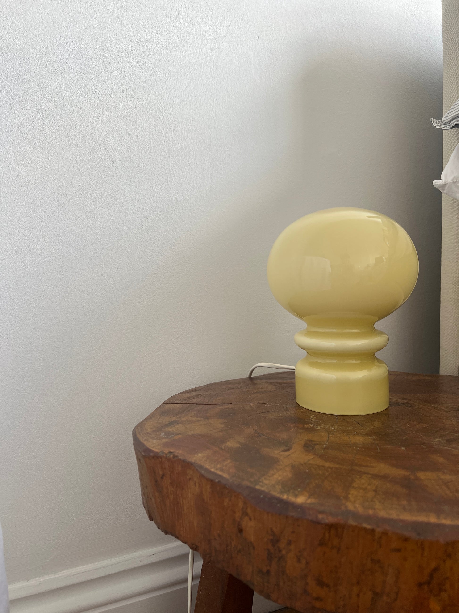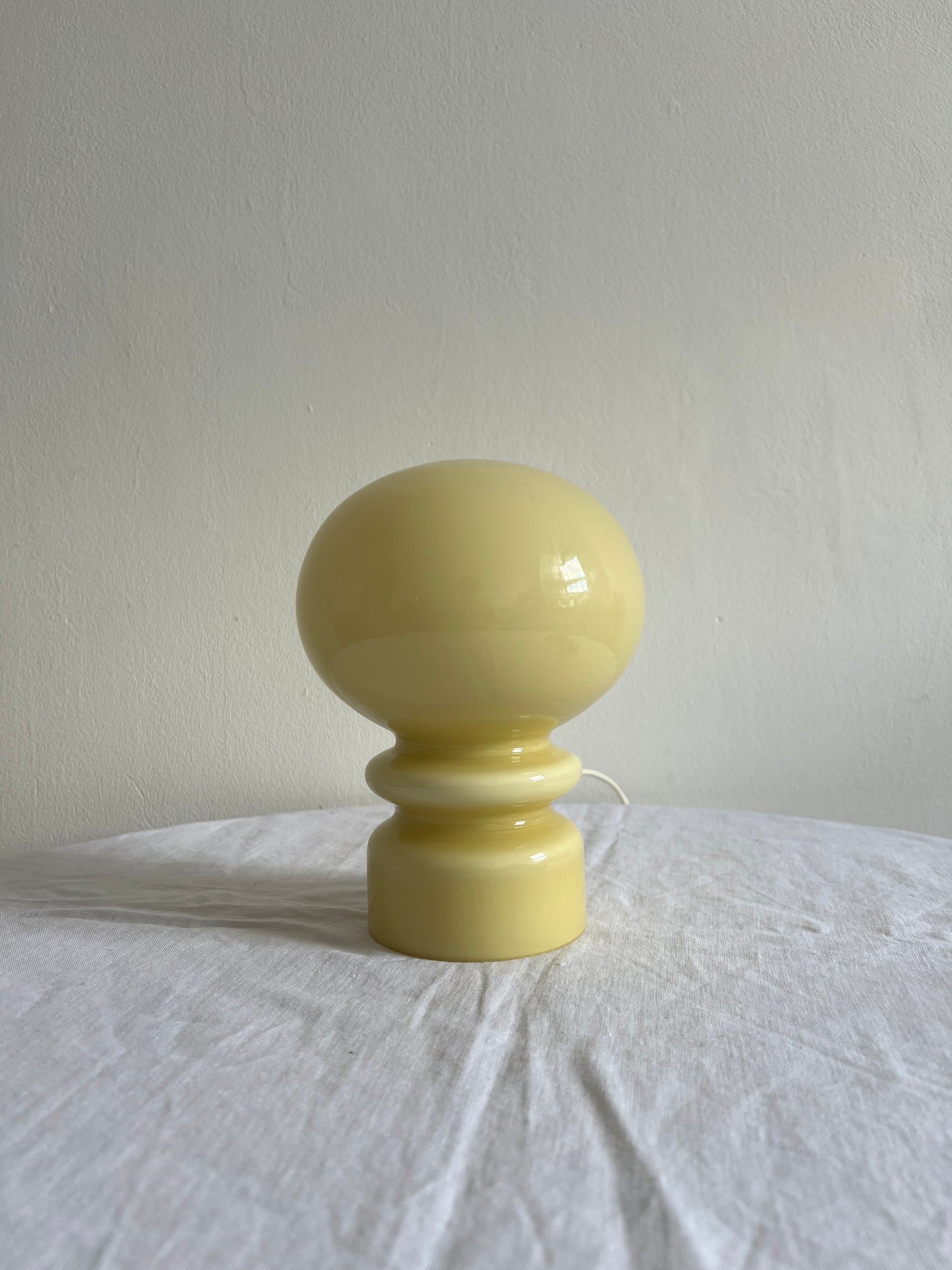 A lamp in the colour of the moment – buttery yellow. This small table lamp is made from yellow tinted glass and is in great vintage condition.