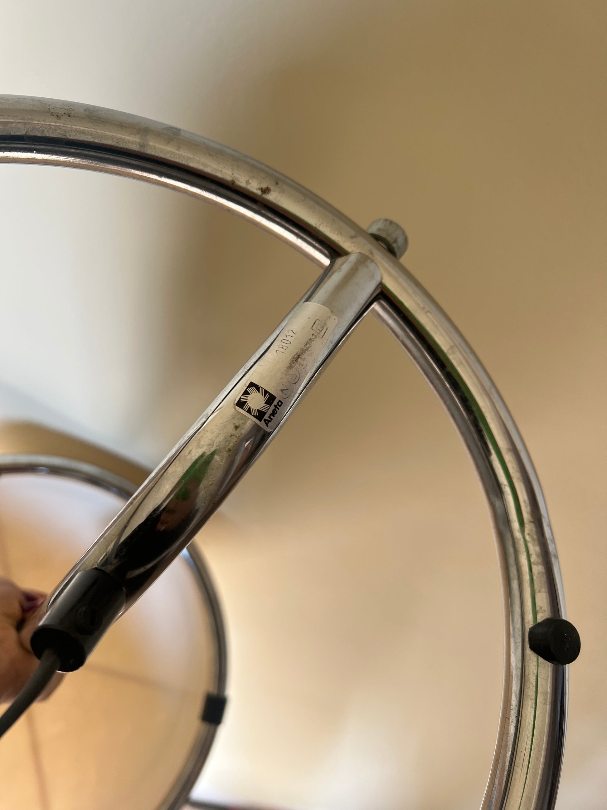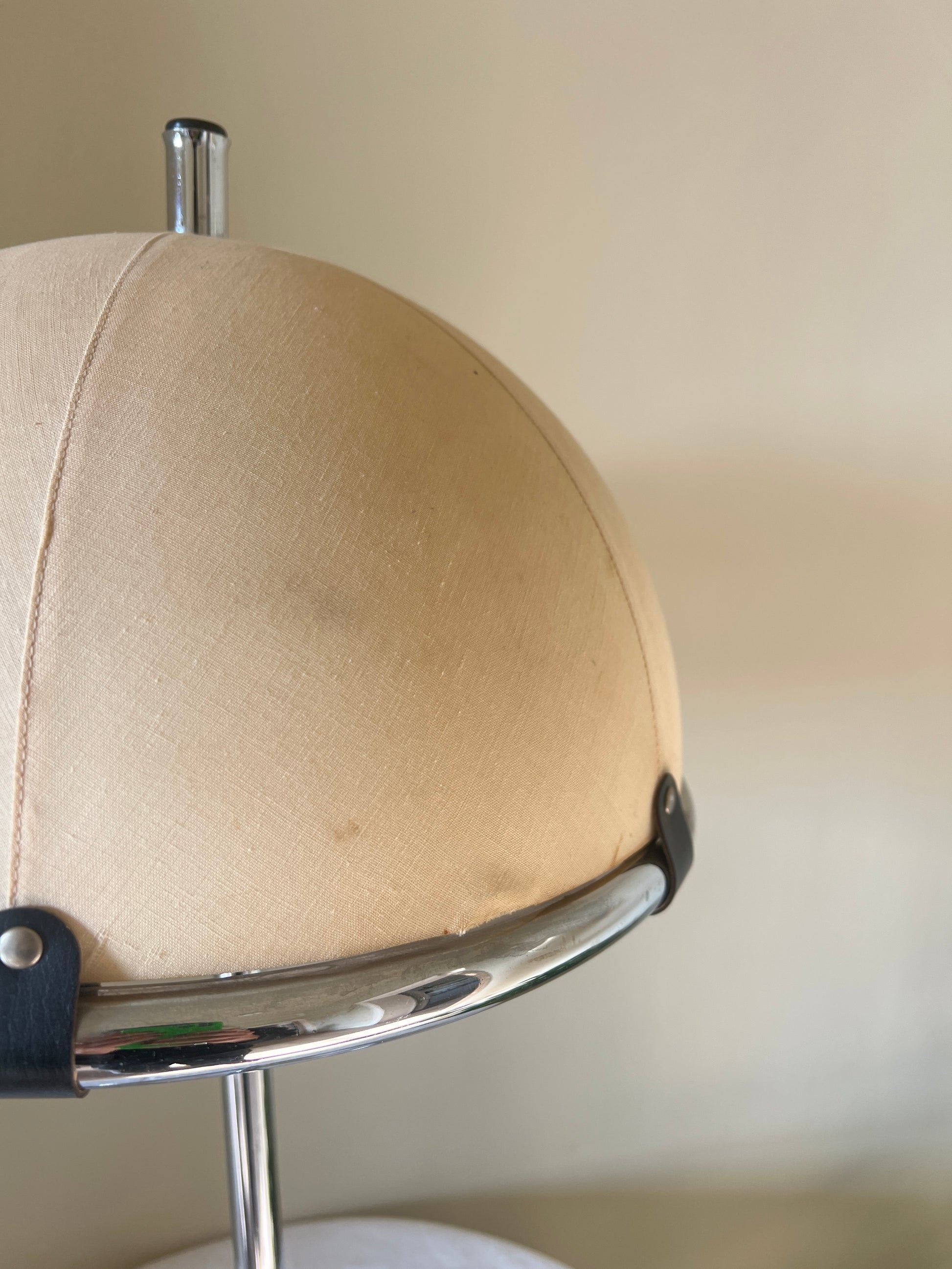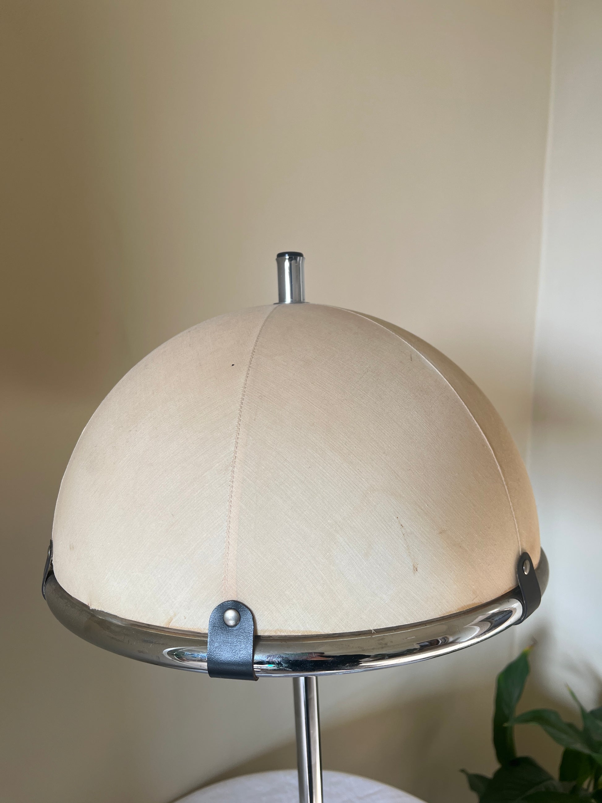 This large table lamp was made by Aneta in Sweden, and is a real statement. This would look great on a large sideboard. The chrome is in excellent condition however there are a few marks on the cream fabric including a slight tear but they aren't really noticeable until you look closely.