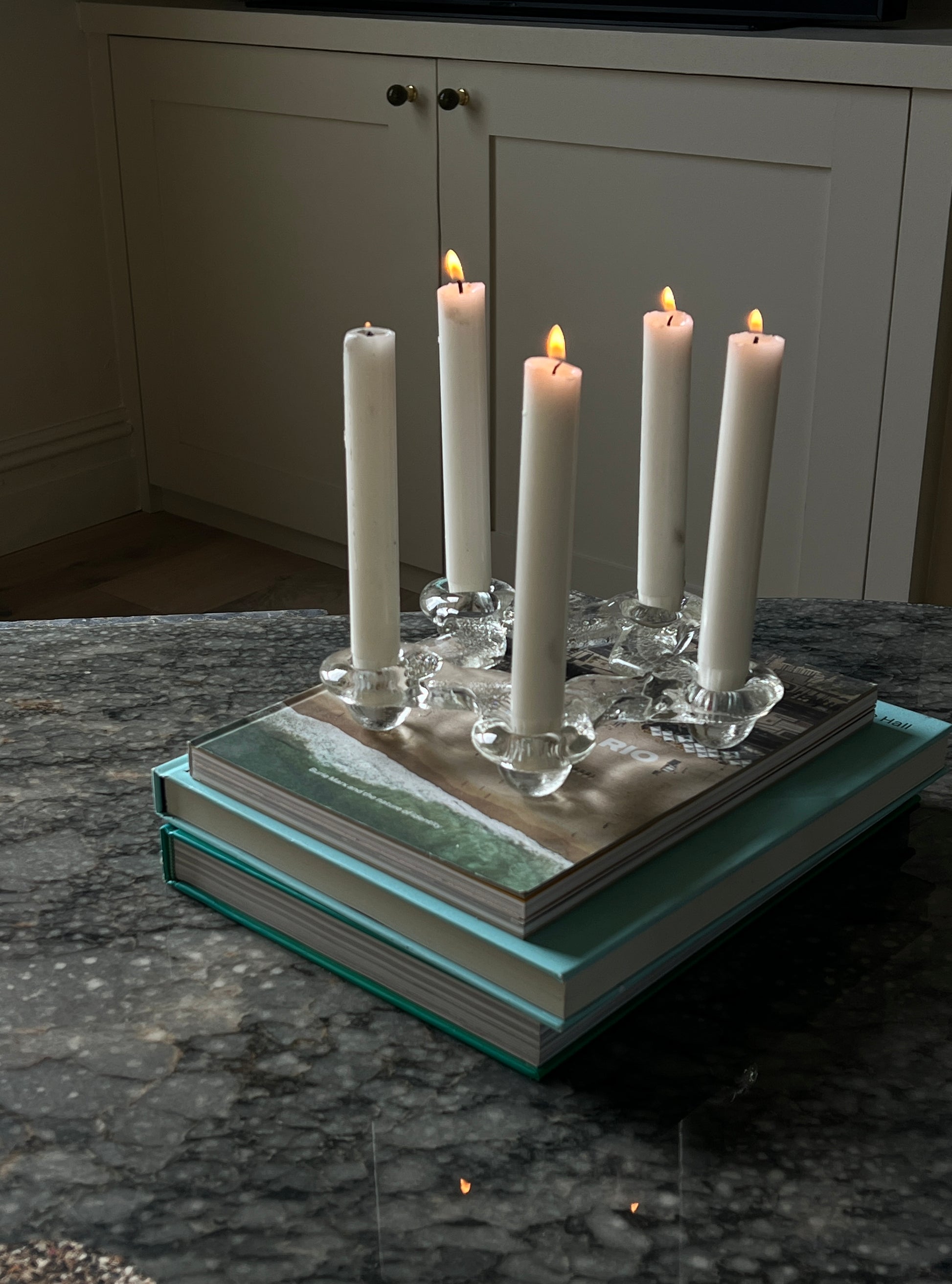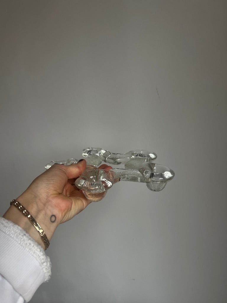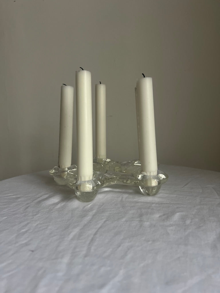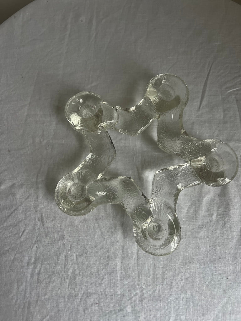 This piece is by Pukeberg, a glassworks in Sweden, has a history that dates back to 1871. The candle holder is made of solid glass and in the shape of a star, holding up to five candles. This piece is in great condition.
