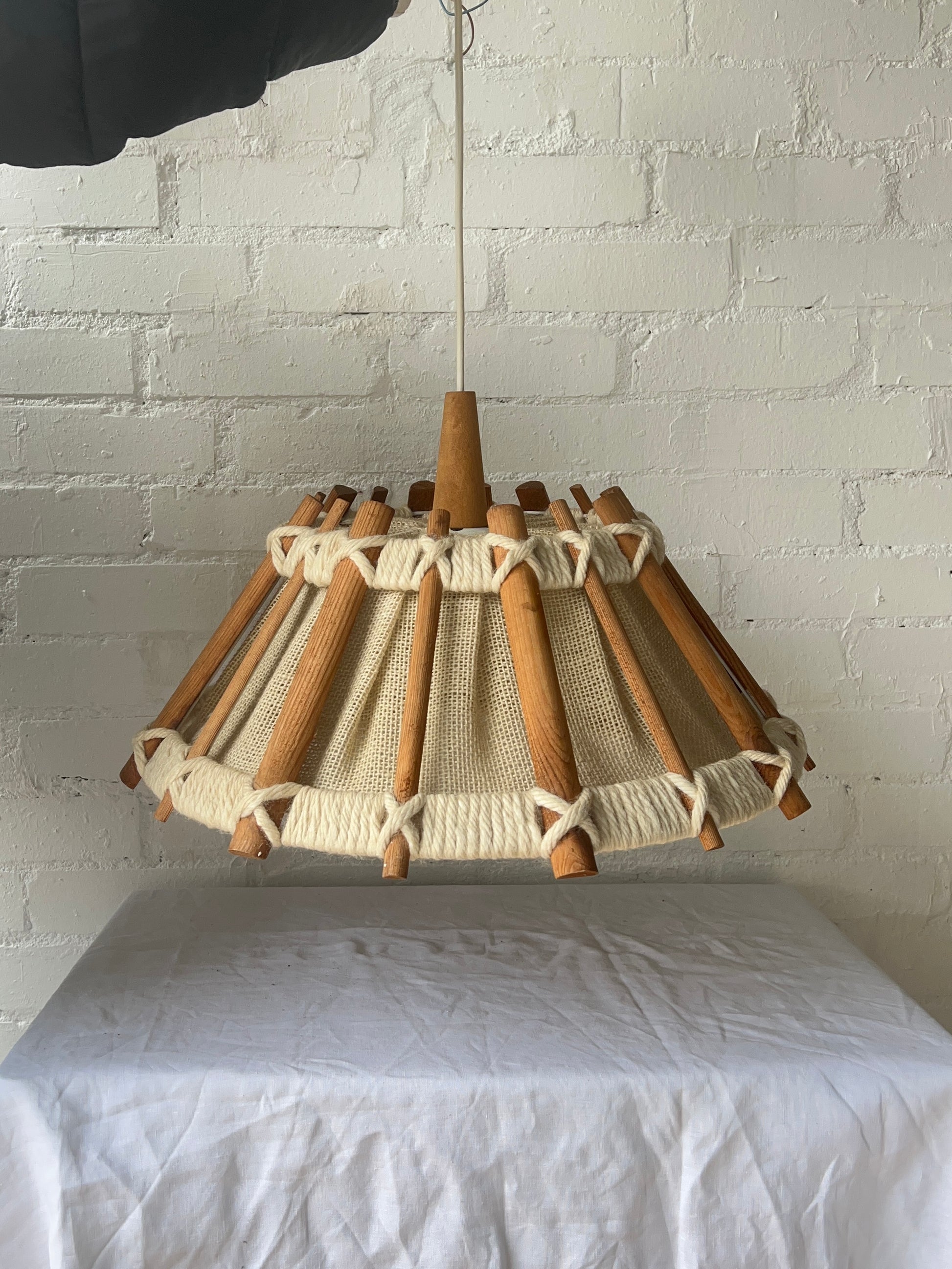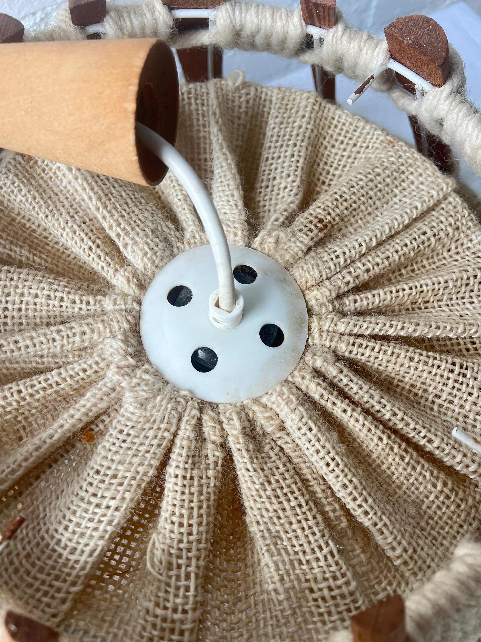 This pendant light shade has a woven and wood design and features a conical shade made from natural wood rods, that is secured by thick cream-coloured rope and is lined with textured burlap fabric. This has been sourced from France and dates back to the 70s. Comes with a white flex but isn't earthed. The current lamp holder fits an E17 bulb.