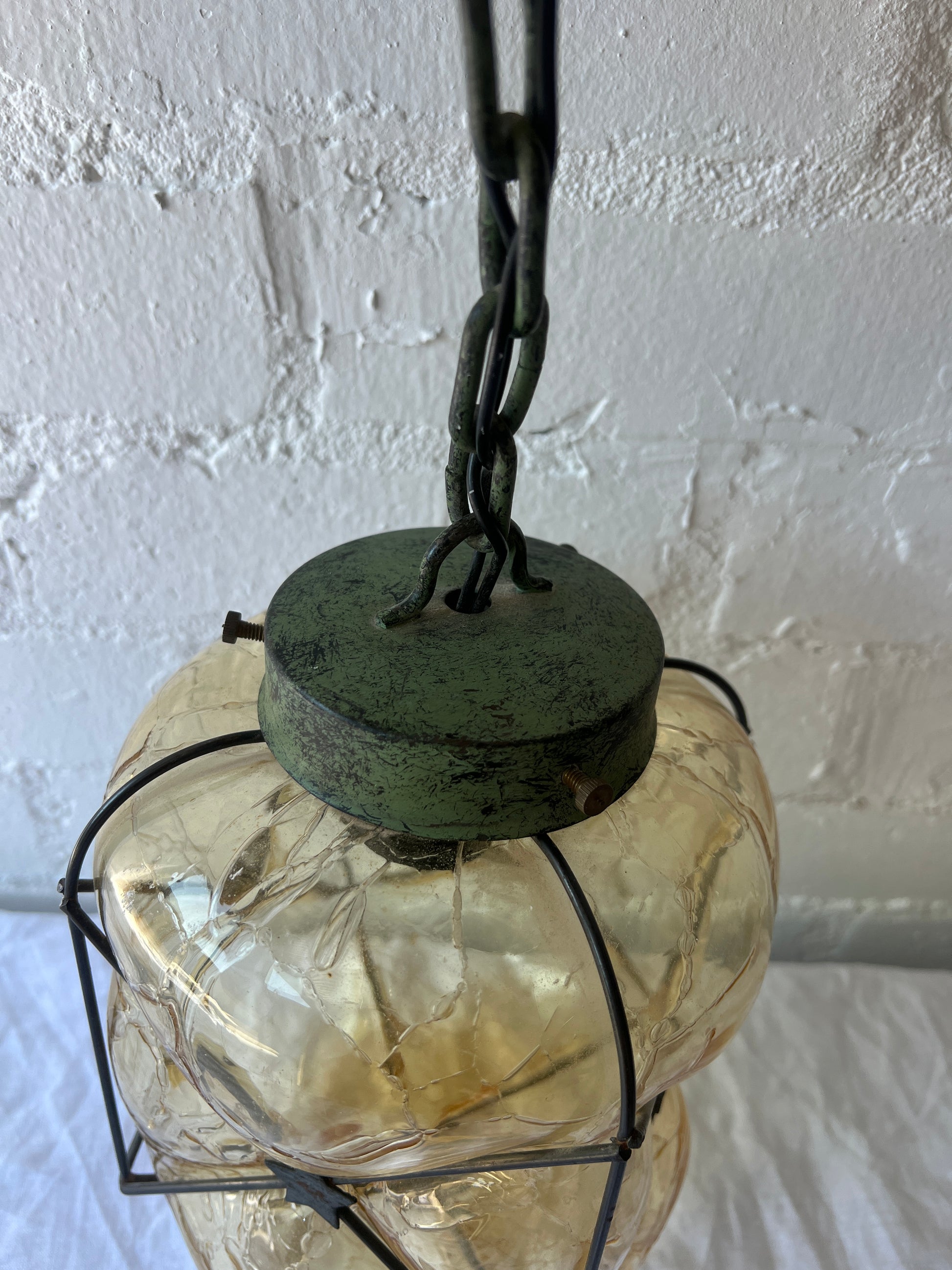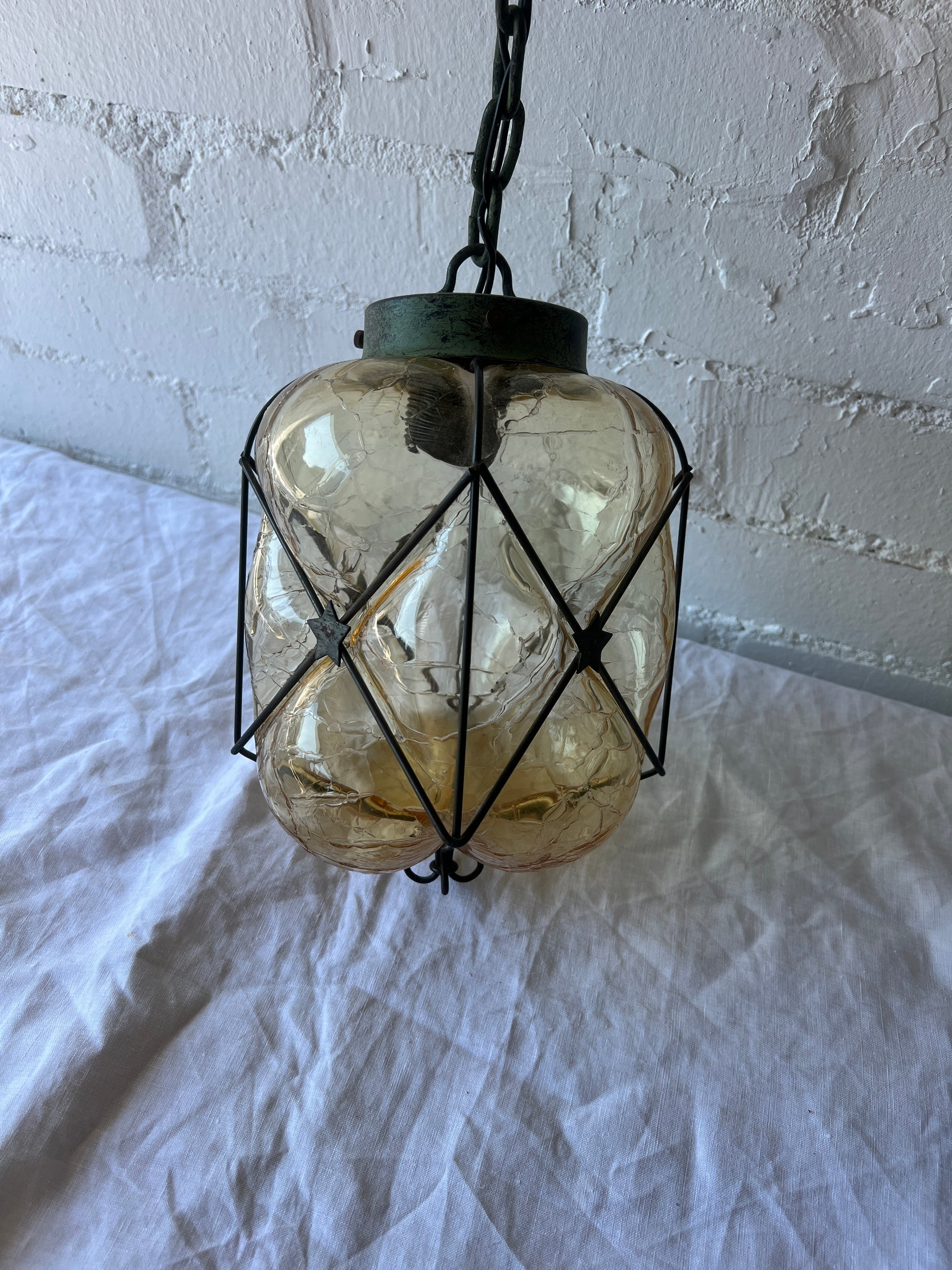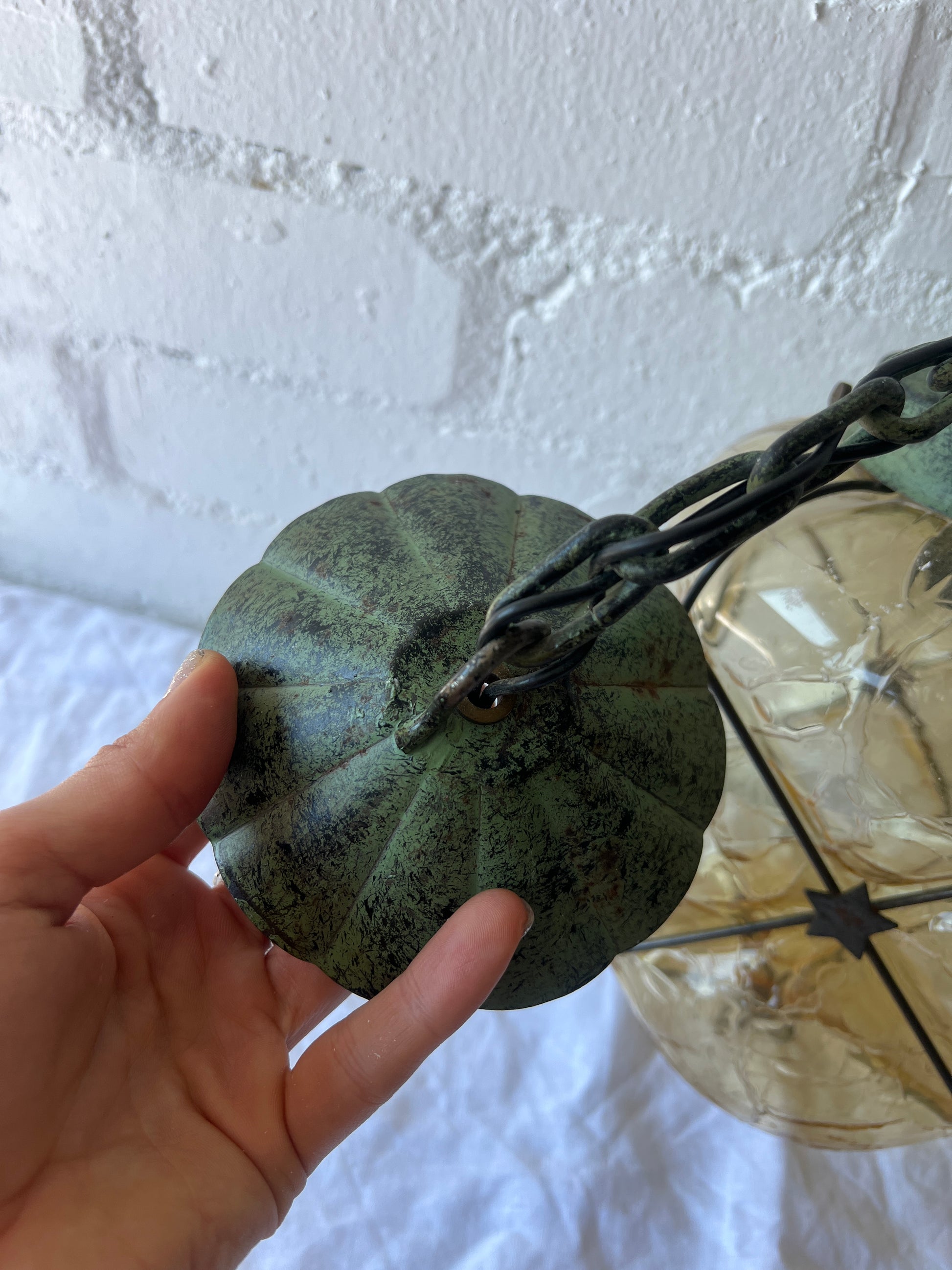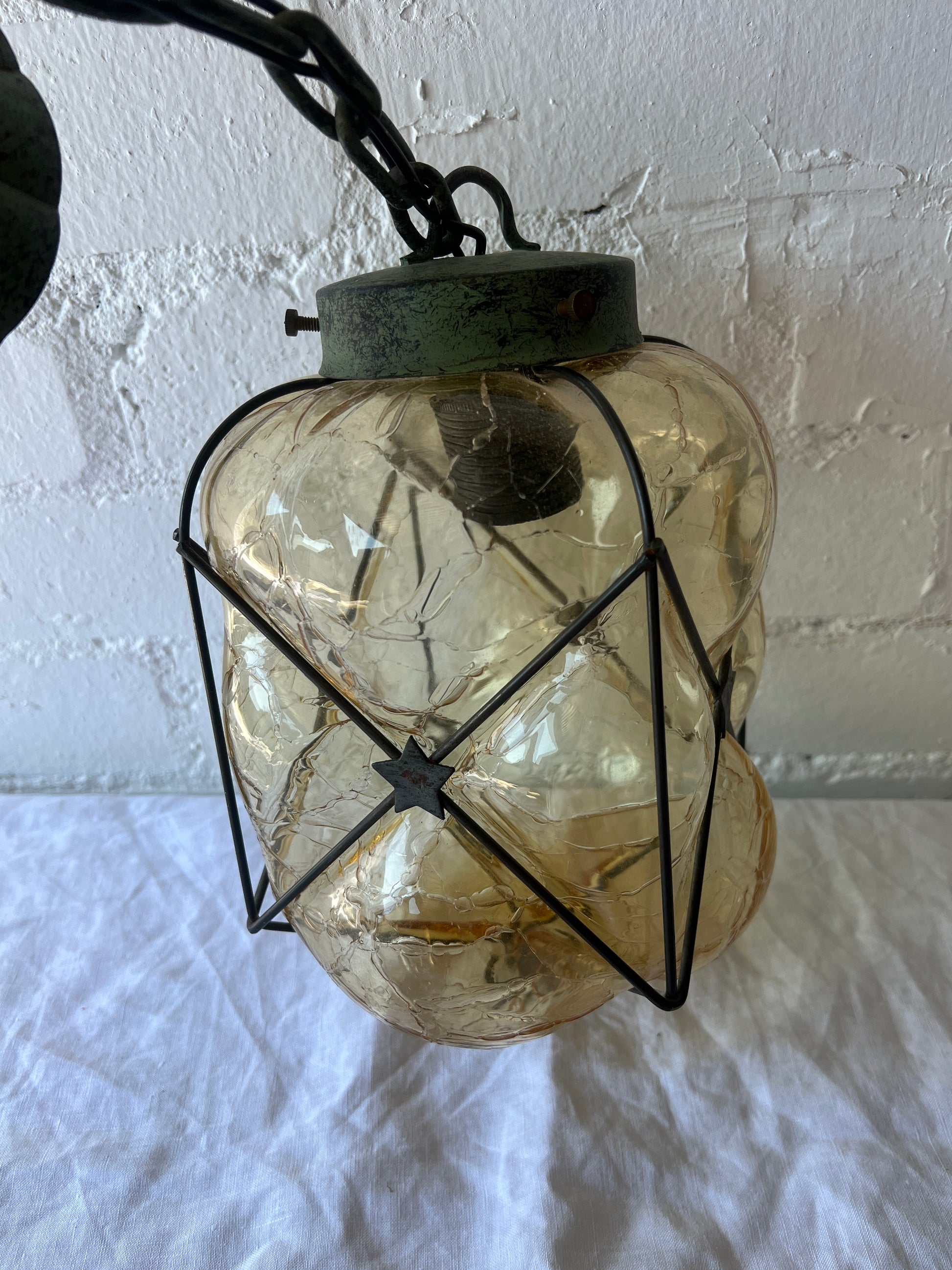 Some slight rust on the metal but this adds to its character. Needs an E17 screw in bulb and will need to be hardwired into a ceiling. Good vintage condition