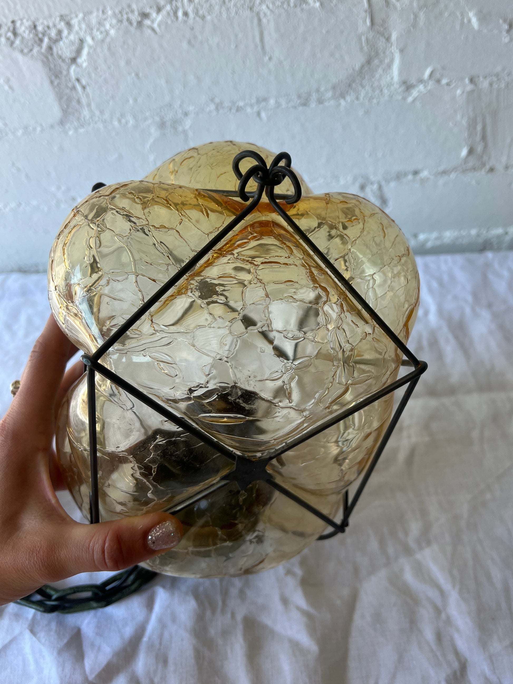 This gorgeous pendant is made of crackled amber glass and has a metal frame around the glass with with star motifs – would look gorgeous hung in a hallway or bathroom. Sourced from Sweden.