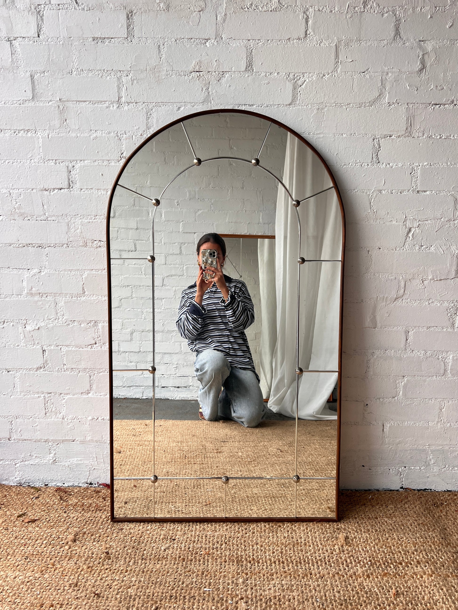 A superb arched sectional mirror, this dates back to the 50s/60s and has arched border  with circular metal bolts holding the sections of glass in place. This mirror has a teak frame and would look stunning in a hallway.There are some slight marks on this but can only be seen when looking close. Overall, this is in great vintage condition. See last picture.