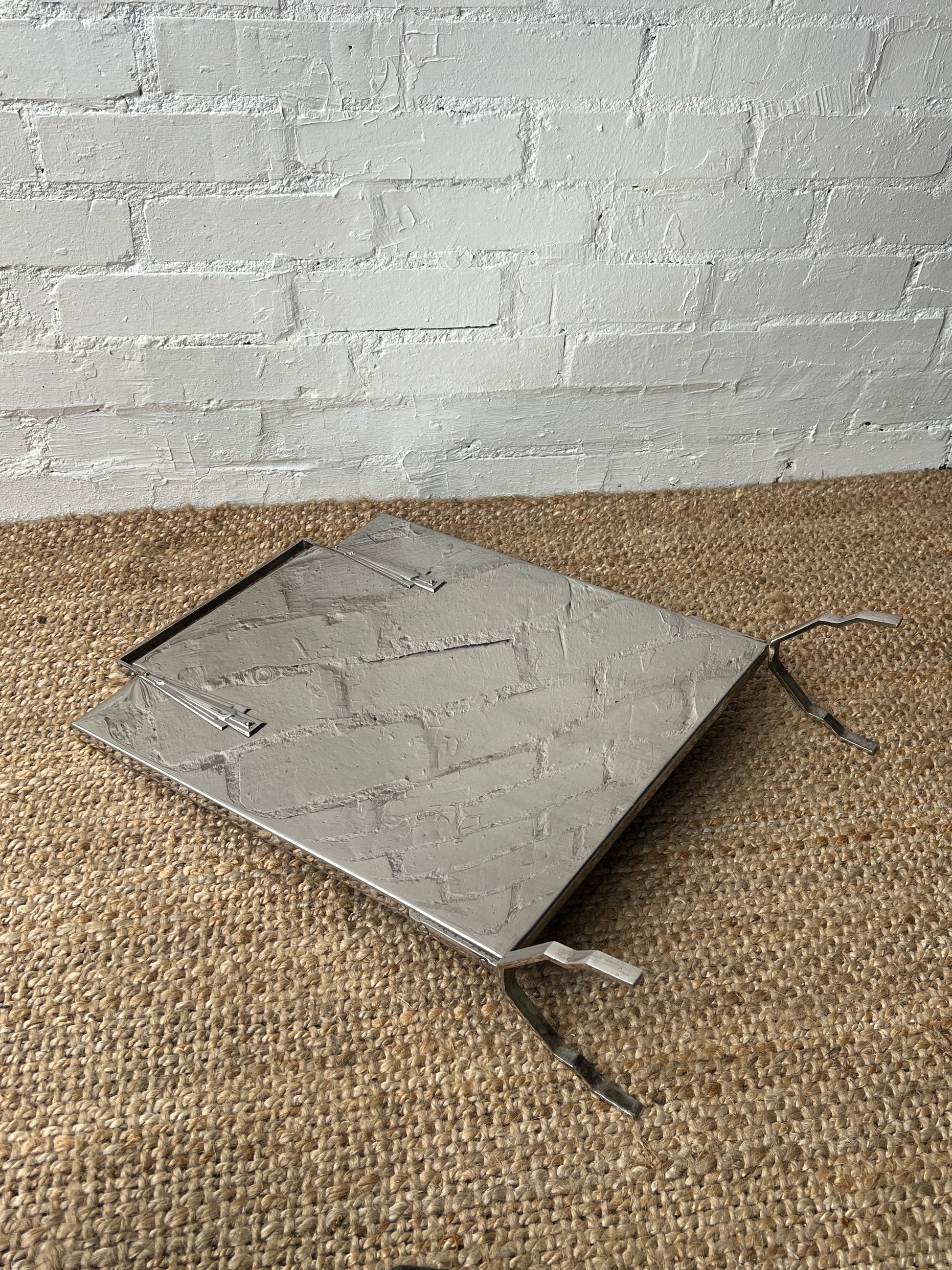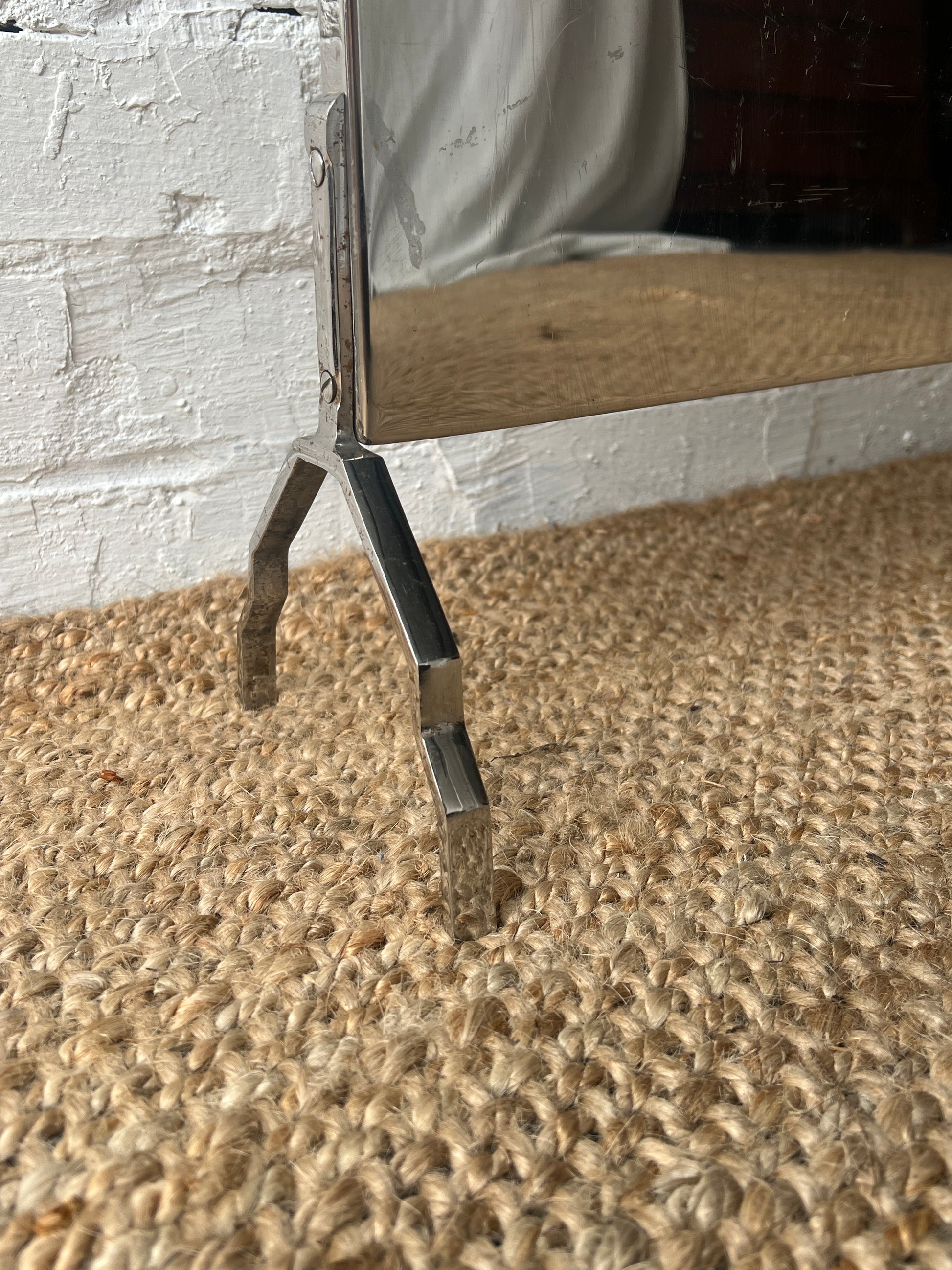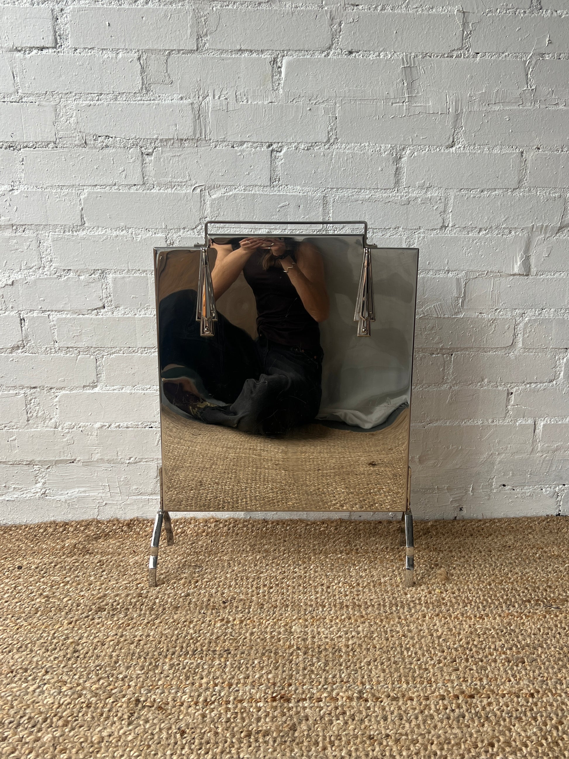 Art deco fireguard with the classic art deco motifs either side of the handle. The reflective panel sits on detailed legs. A few scratches on this, please see pictures, but you can't really see due to the reflectiveness and until looking up close. Would look really fun in front of a fire place!