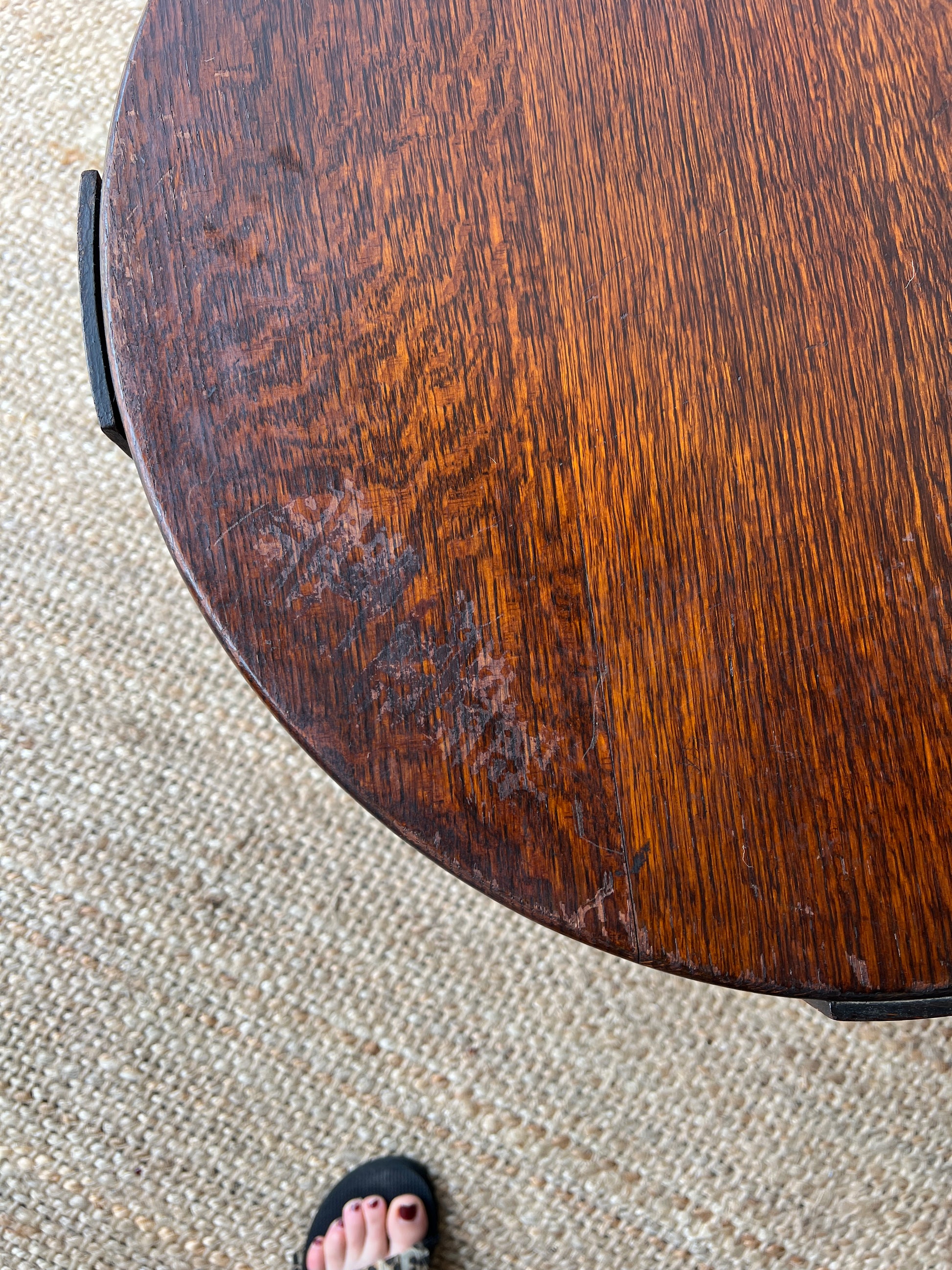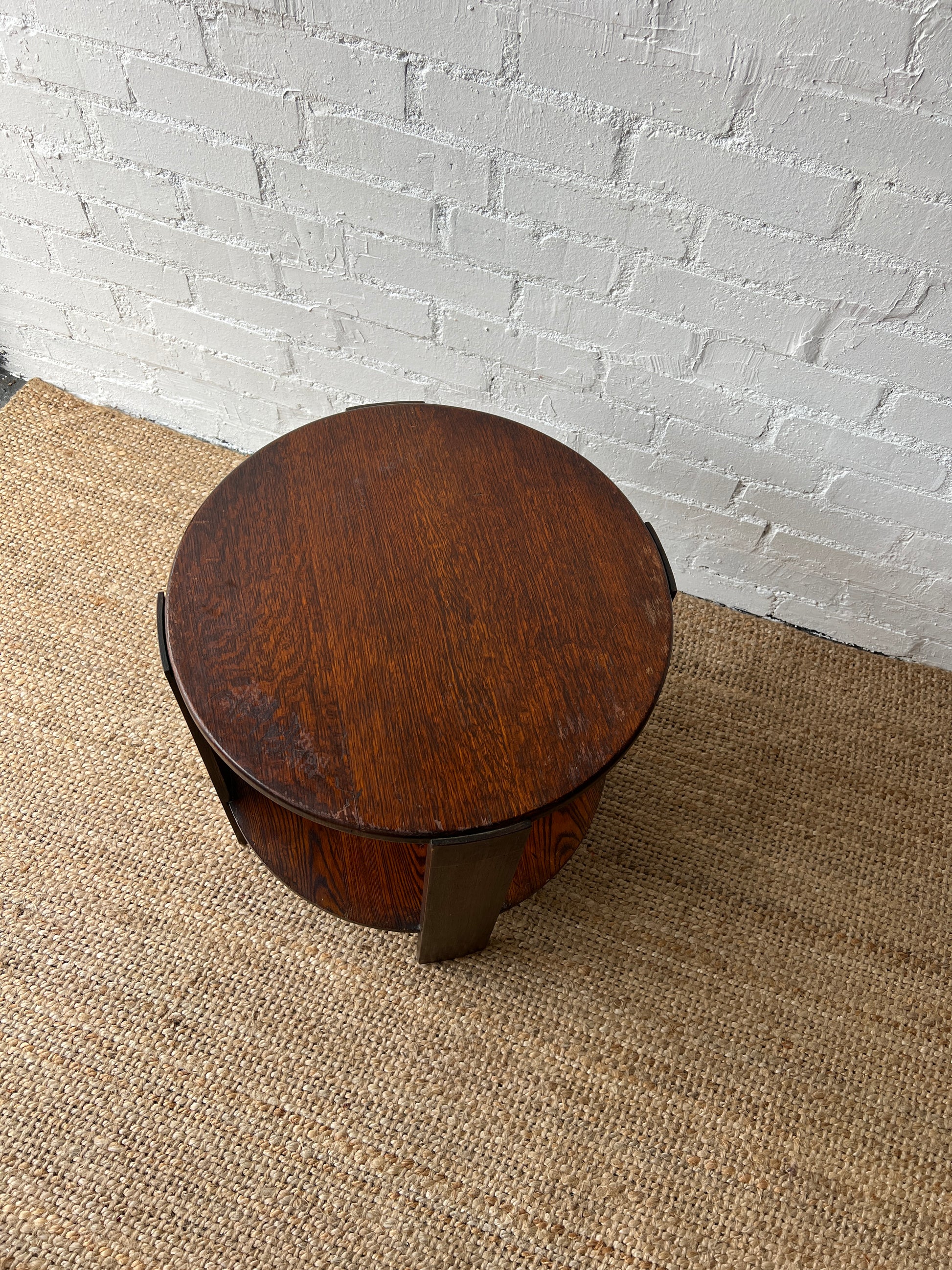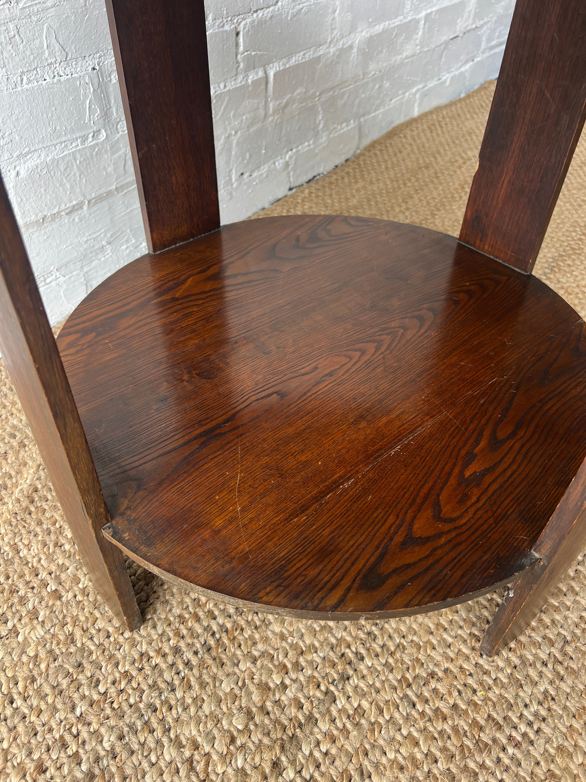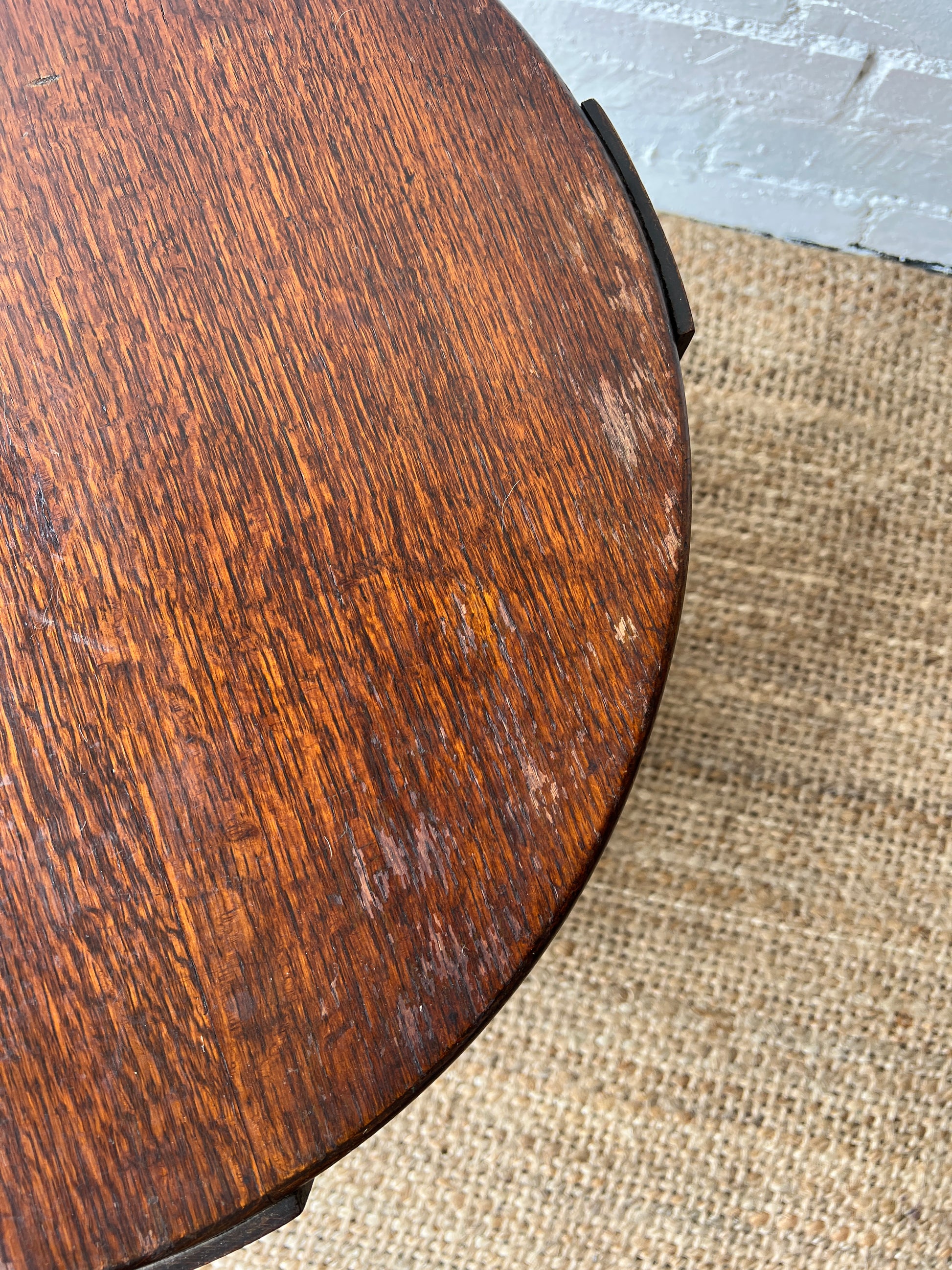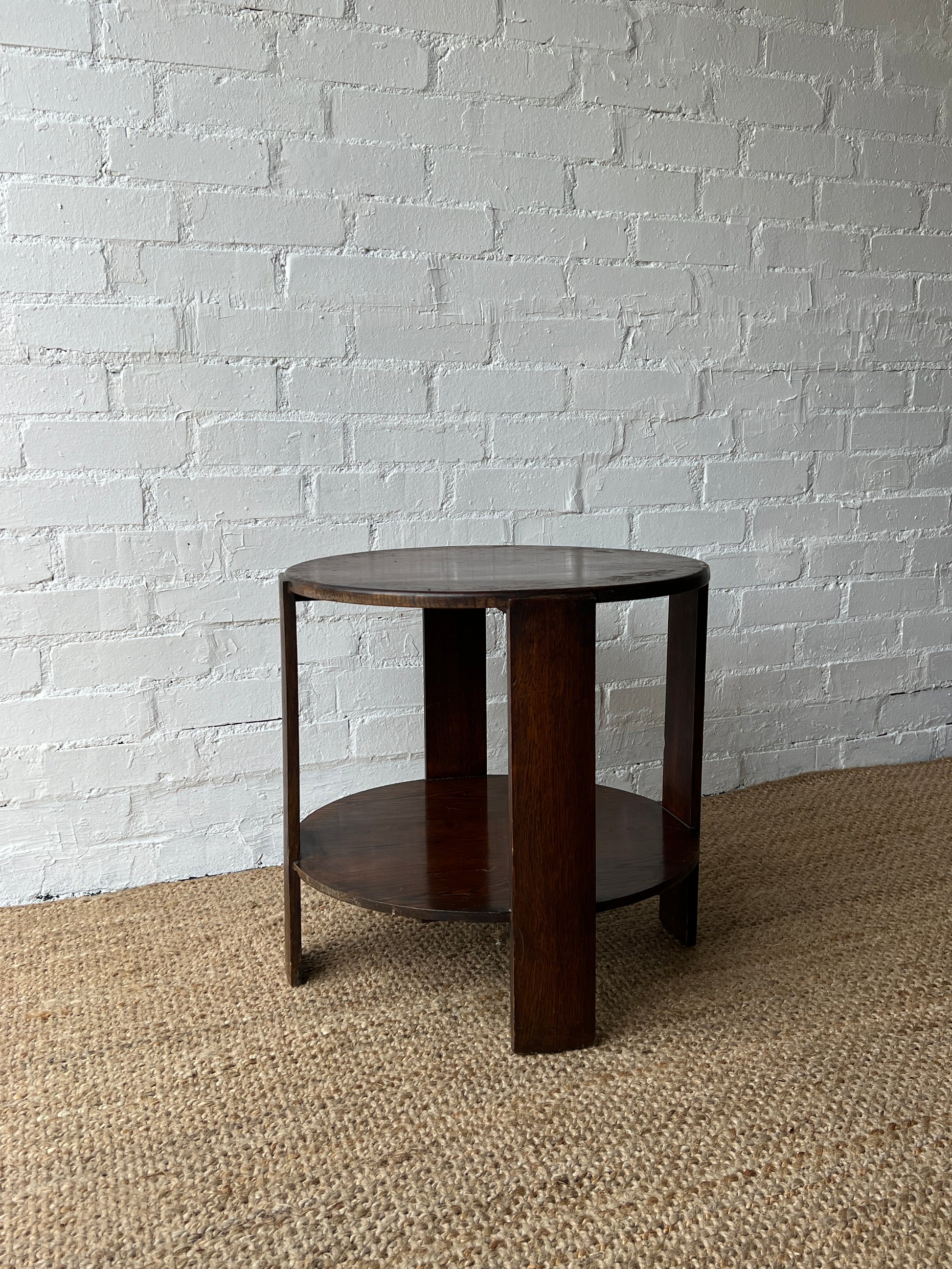 round wooden side table has a dark stained finish and dates back to the mid century. The table has a lower shelf and is a good height to go next to a sofa. There is some slight damage on the top, see pictures. Overall good condition!