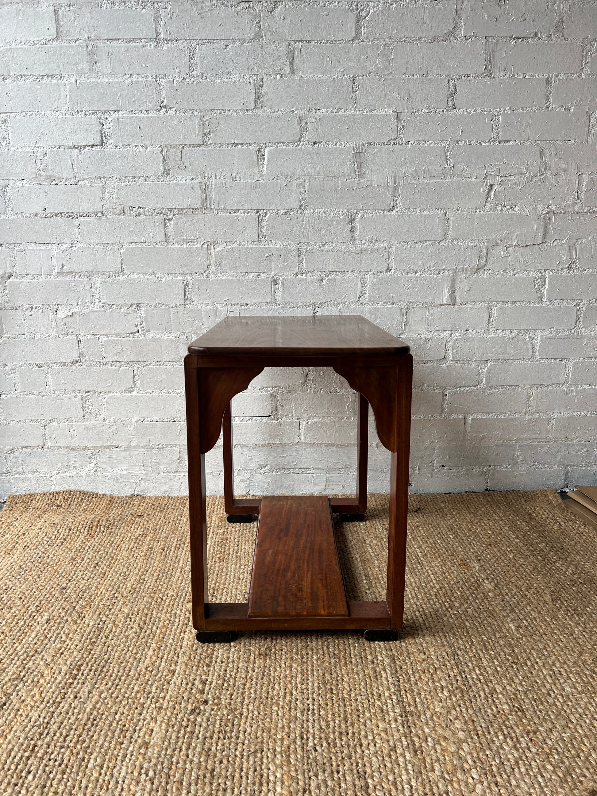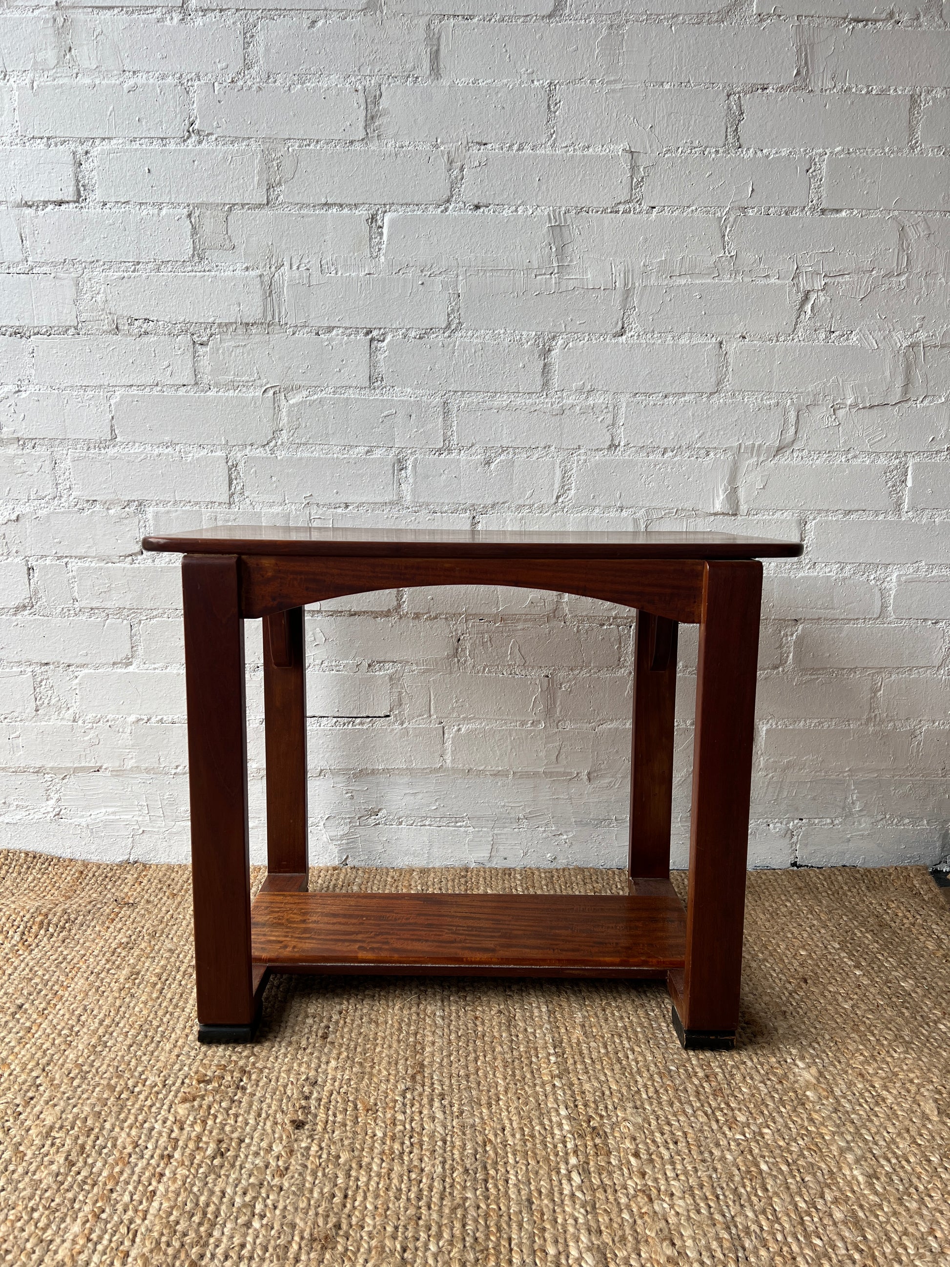 A curved 60s wooden side table features that sits on black rectangular feet. This table is the perfect height and length to go next to a sofa. A few small marks on the top but overall great condition.