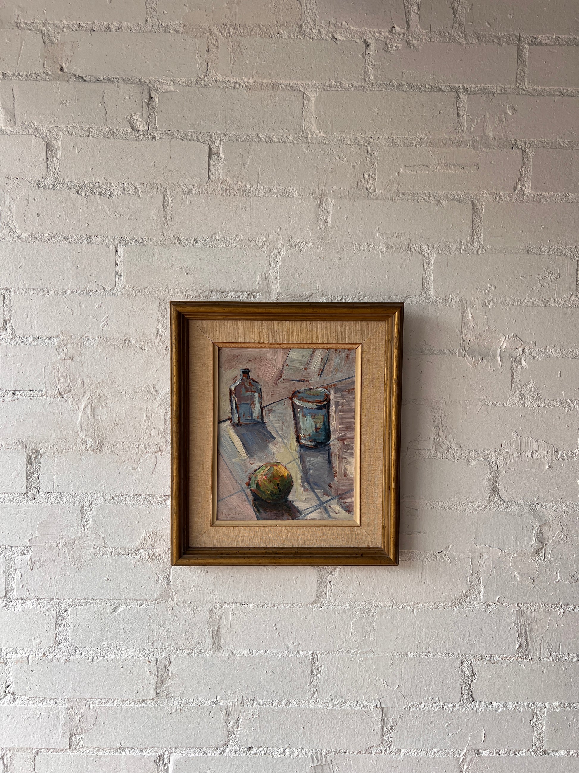 This paining by the Swedish artist, Magne Ahlqvist. This is a small still life oil shows an arrangement of fruit, a glass jar and bottle. The piece shows the light and shadow through expressive brushstrokes, using a muted earthy toned colour palette. I can see this going in a kitchen.