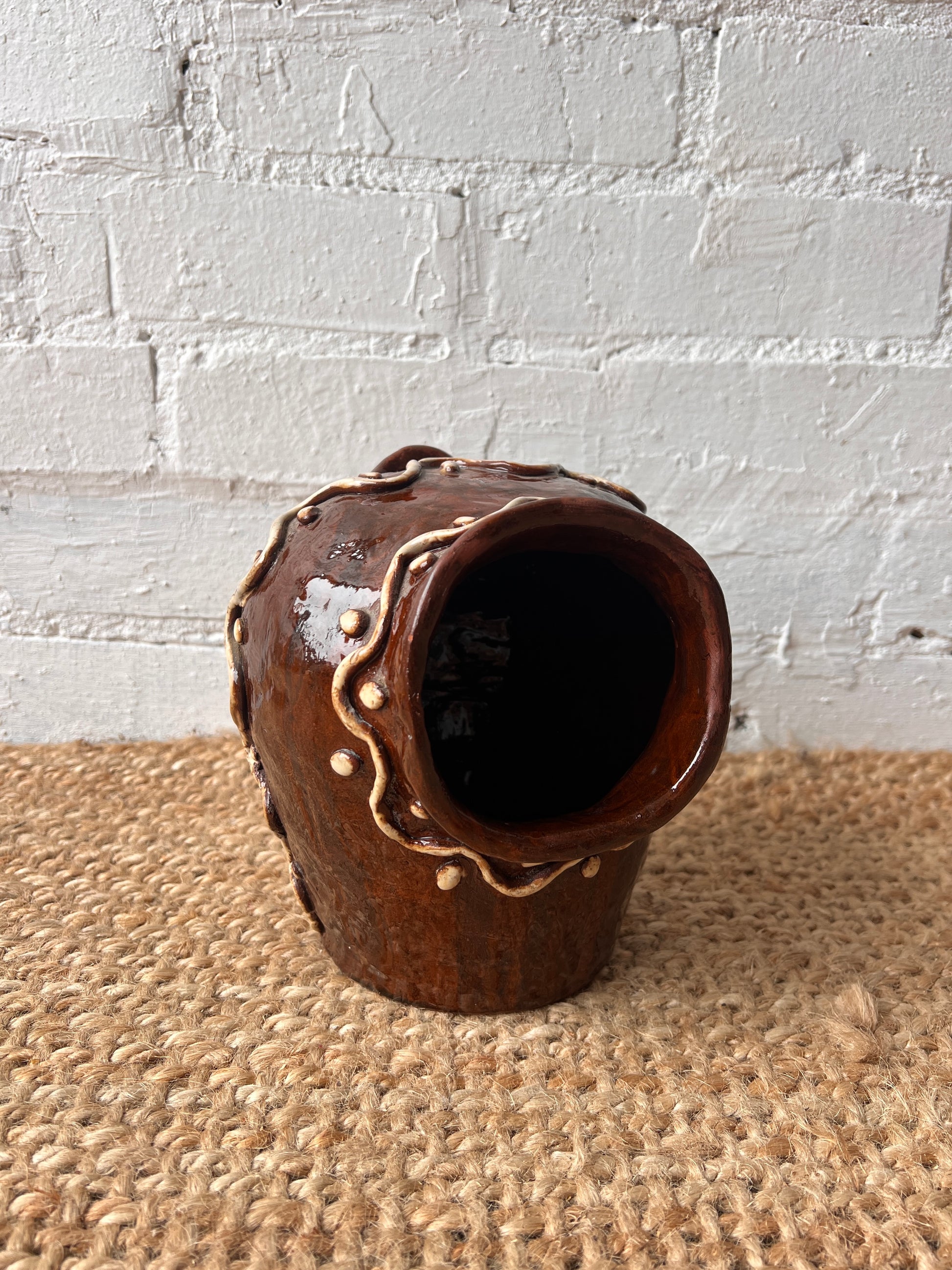 This handcrafted ceramic salt pig is finished in a rich, glossy brown glaze and has a traditional open-front design allows for easy access salts or even garlic. The design is made up or wiggles and dot accents and would look gorgeous on a kitchen top. Excellent vintage condition.