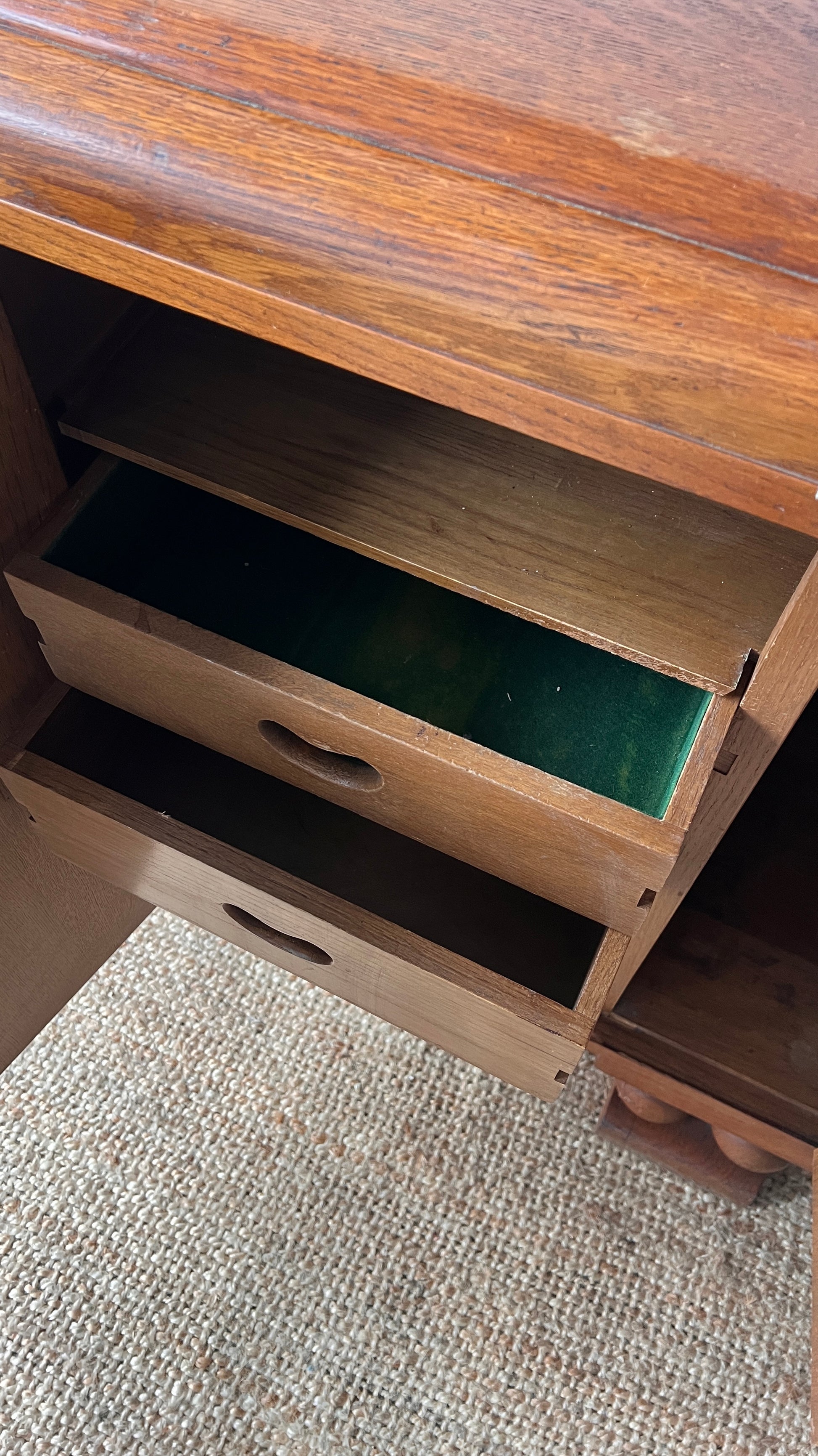 Such an excellent sideboard – this piece is crafted from solid wood and has a honey toned grain and is in excellent condition across. The chrome handles and detail across are superb, with sculptural pull chrome handles and the ball feet the piece sits on.  Inside, on the left is shelf for storage and draws &bottle holders on the right hand side. There are a few light scuffs across the sides but in general this piece is in very good vintage condition. Circa England and 20/30s.
