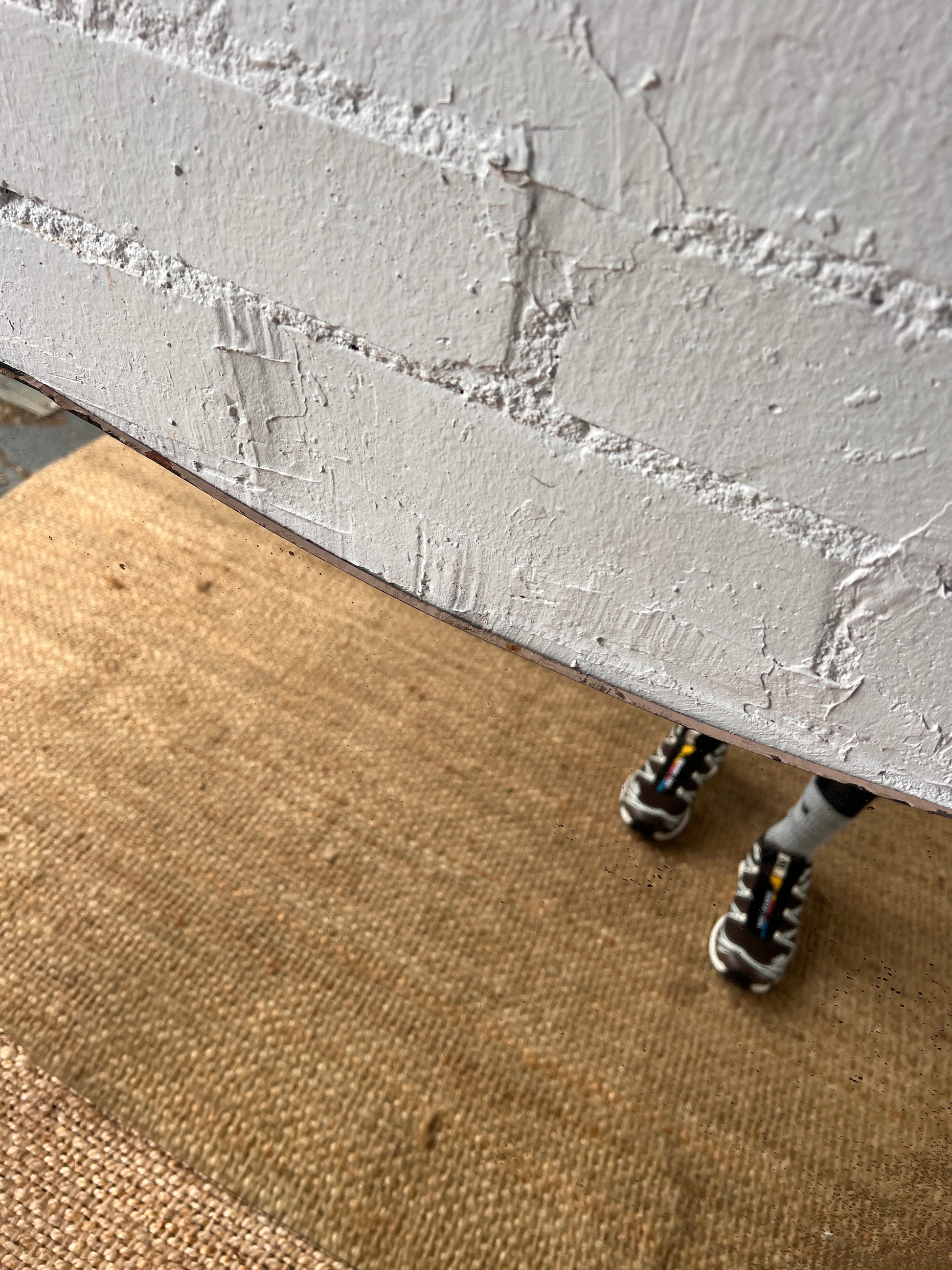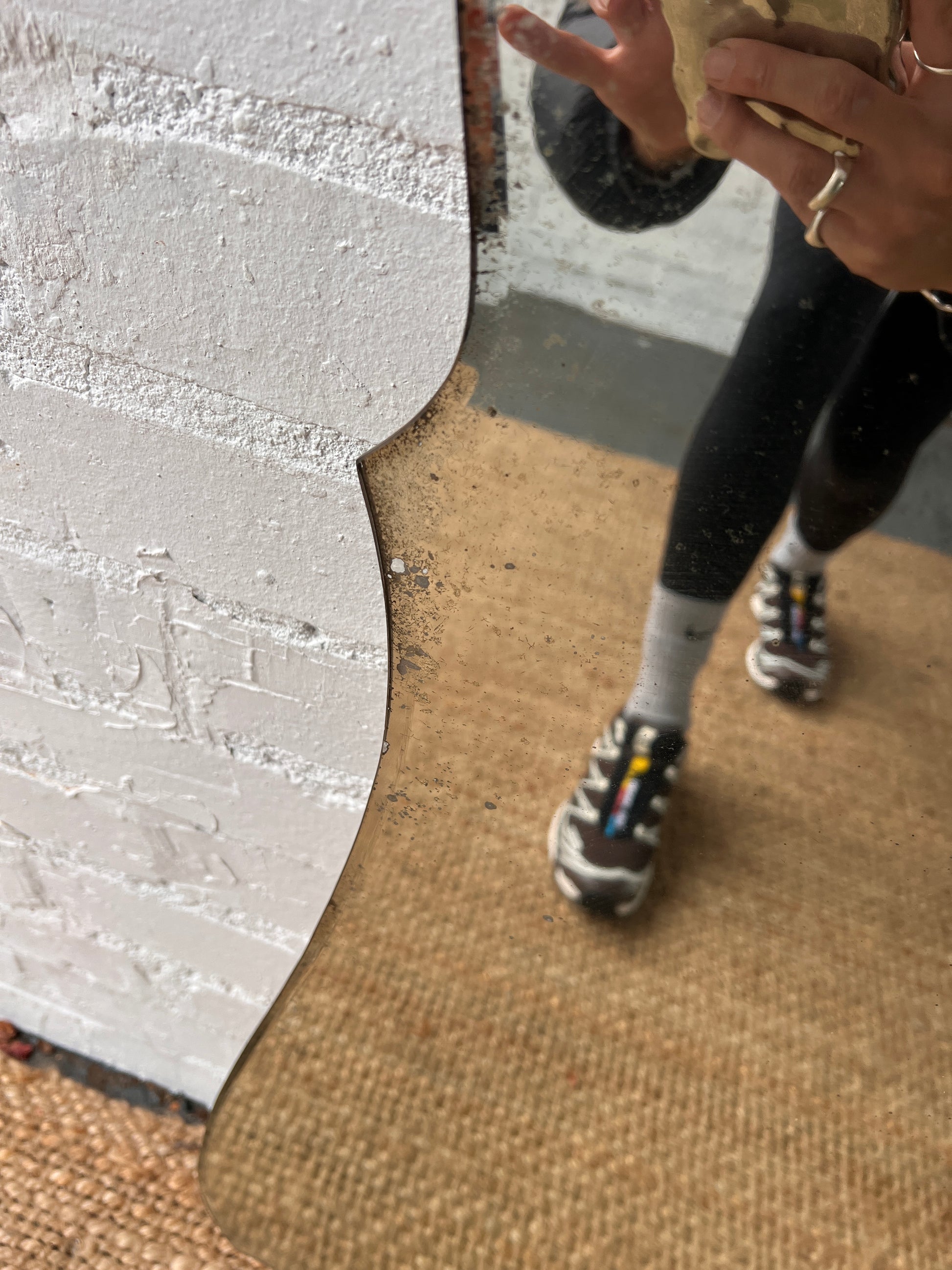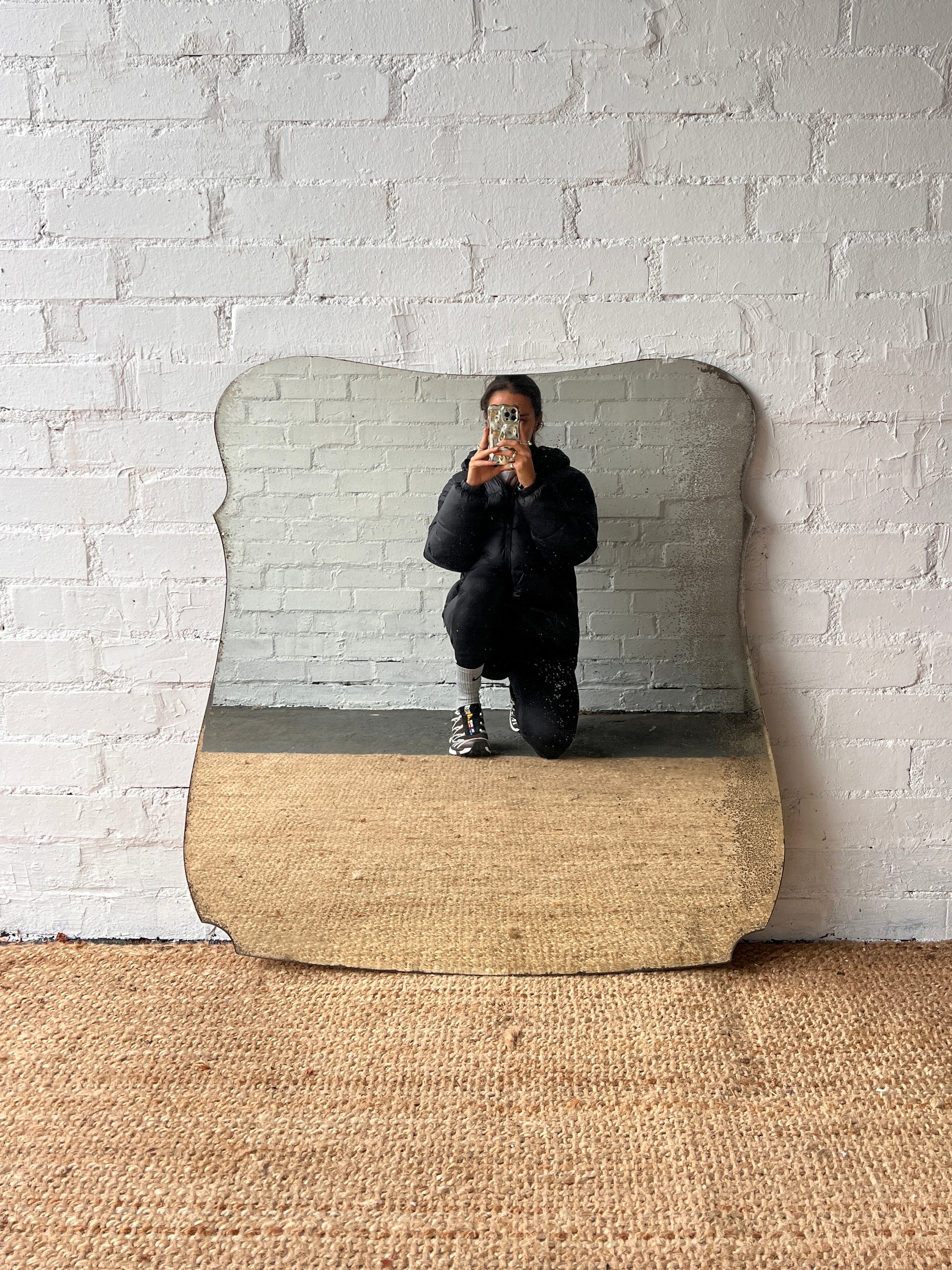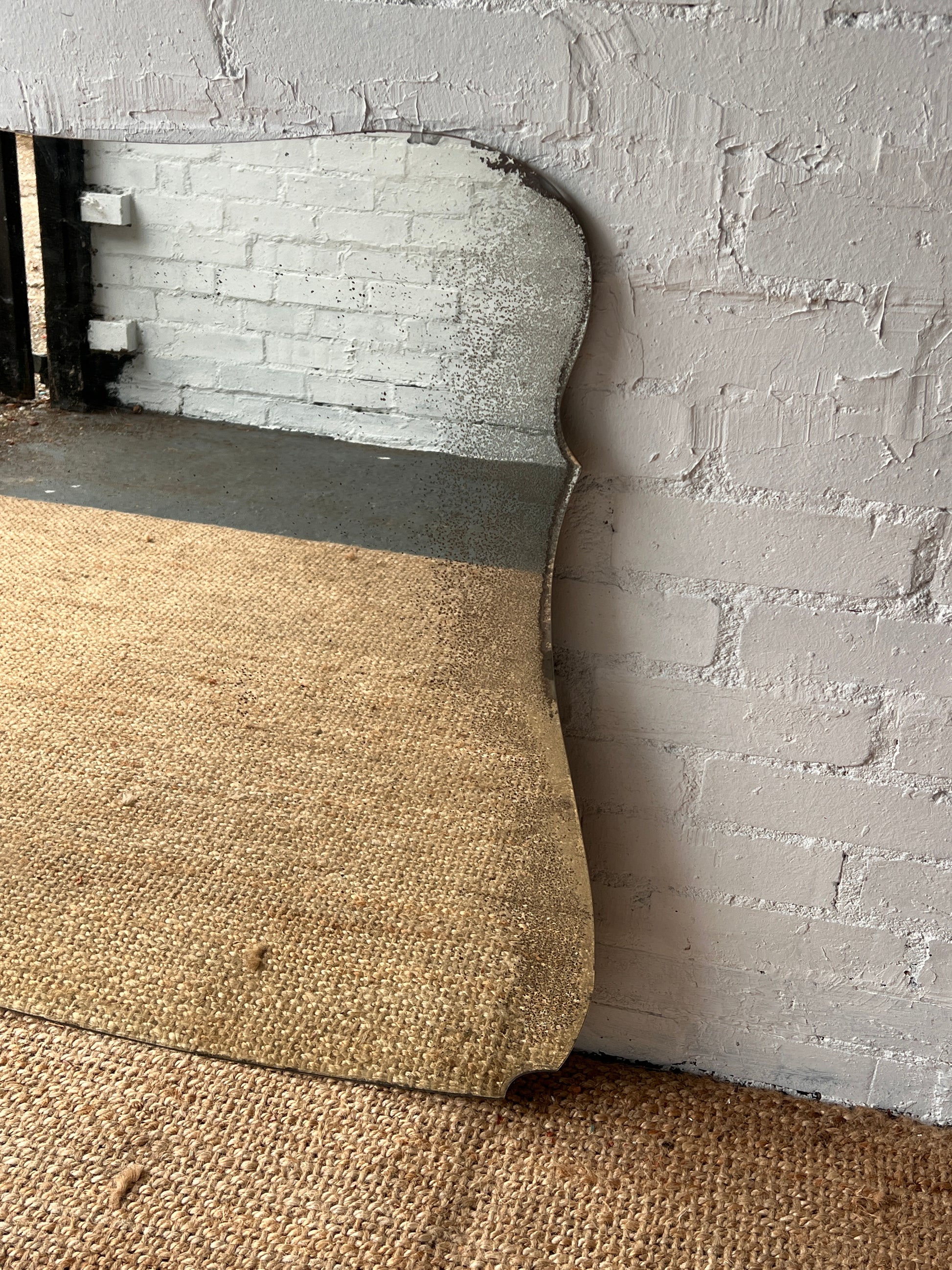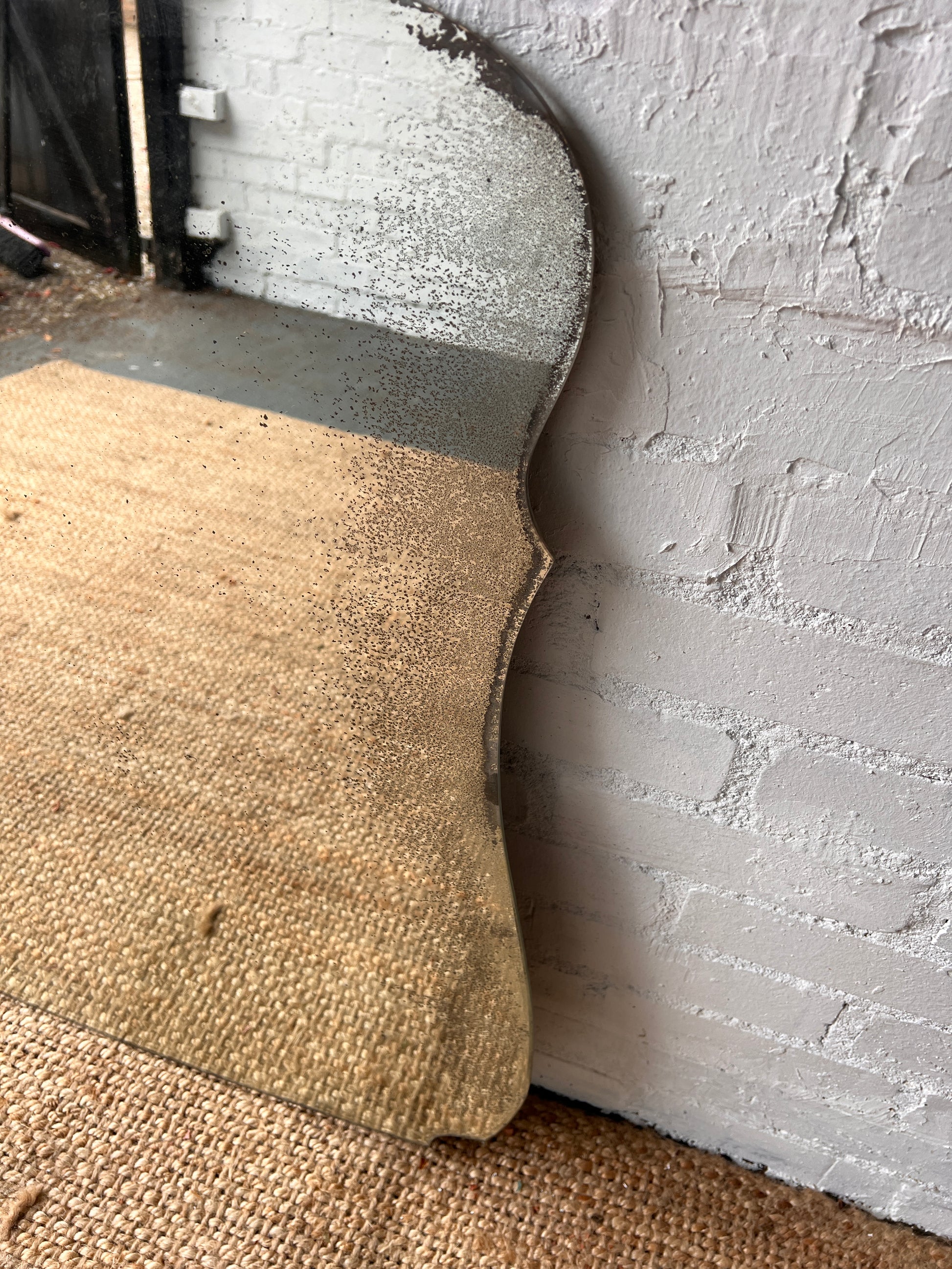 A large frameless mirror sourced from France which would look excellent above a mantle piece. There is some heavy foxing across the whole piece, especially the right side but this gives more of a rustic feel. This would need to be leant on a surface. A few marks on the top rim of the mirror, but wouldn’t be seen if positioned on a mantelpiece for example.