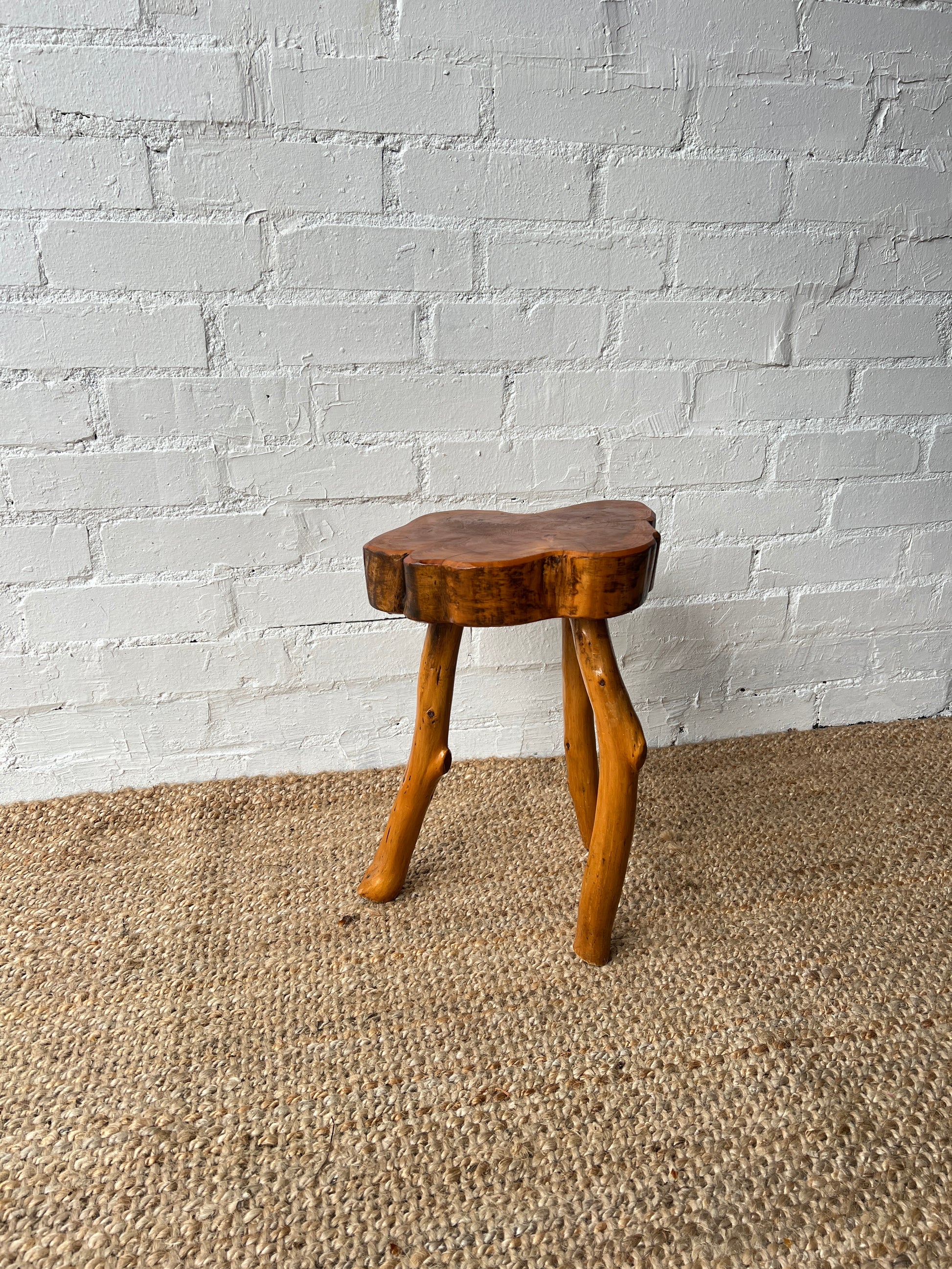 A small live edge side stool narrow legs, sourced from France. I have another stool similar to see, see the right stool in the last image. Would be sweet as a side table or small bedside tables.