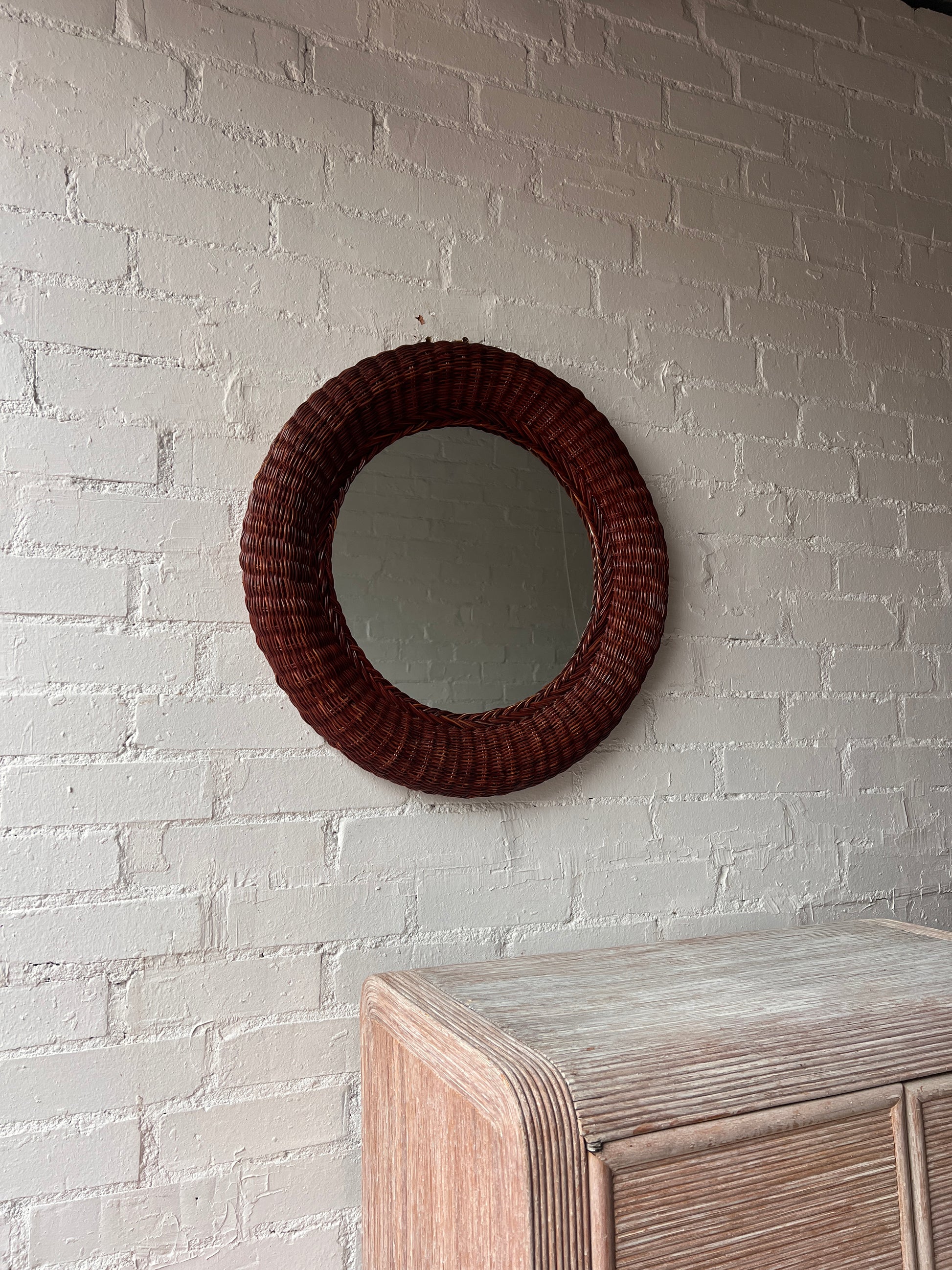 70s Mid century woven rattan round wall mirror which would add great character to a space. Designed using woven rattan, this the wood is rich in colour and I can see it being hung in a bathroom. Great vintage condition.
