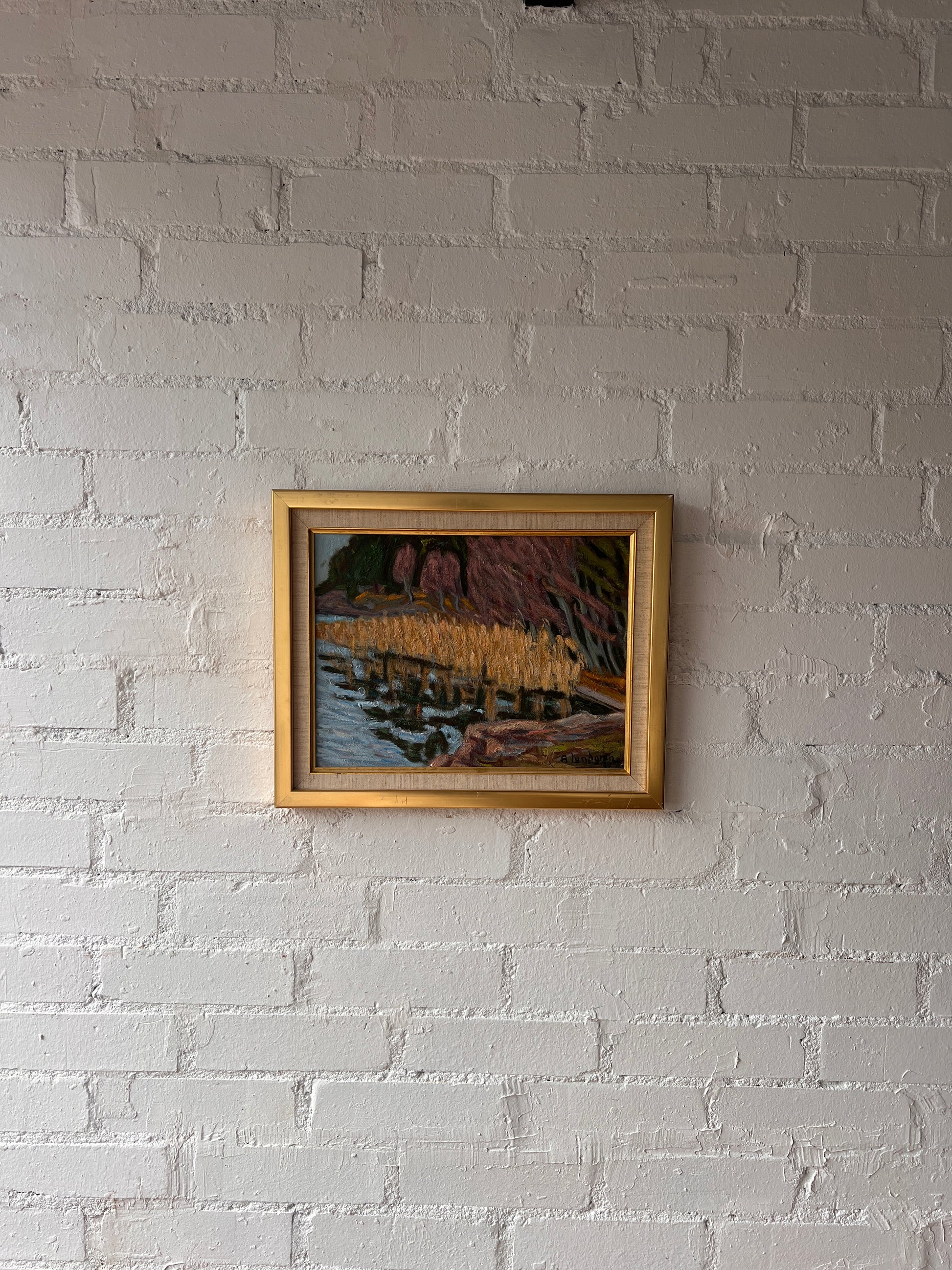 This painting is by the artist Swedish Bertil Lundgren and depicts a colourful lake side landscape in Summer, in a vibrant pink and yellow brush palette. The artist, 1900-1979, was known to paint recurring scenes of nature but non feel too decorative.