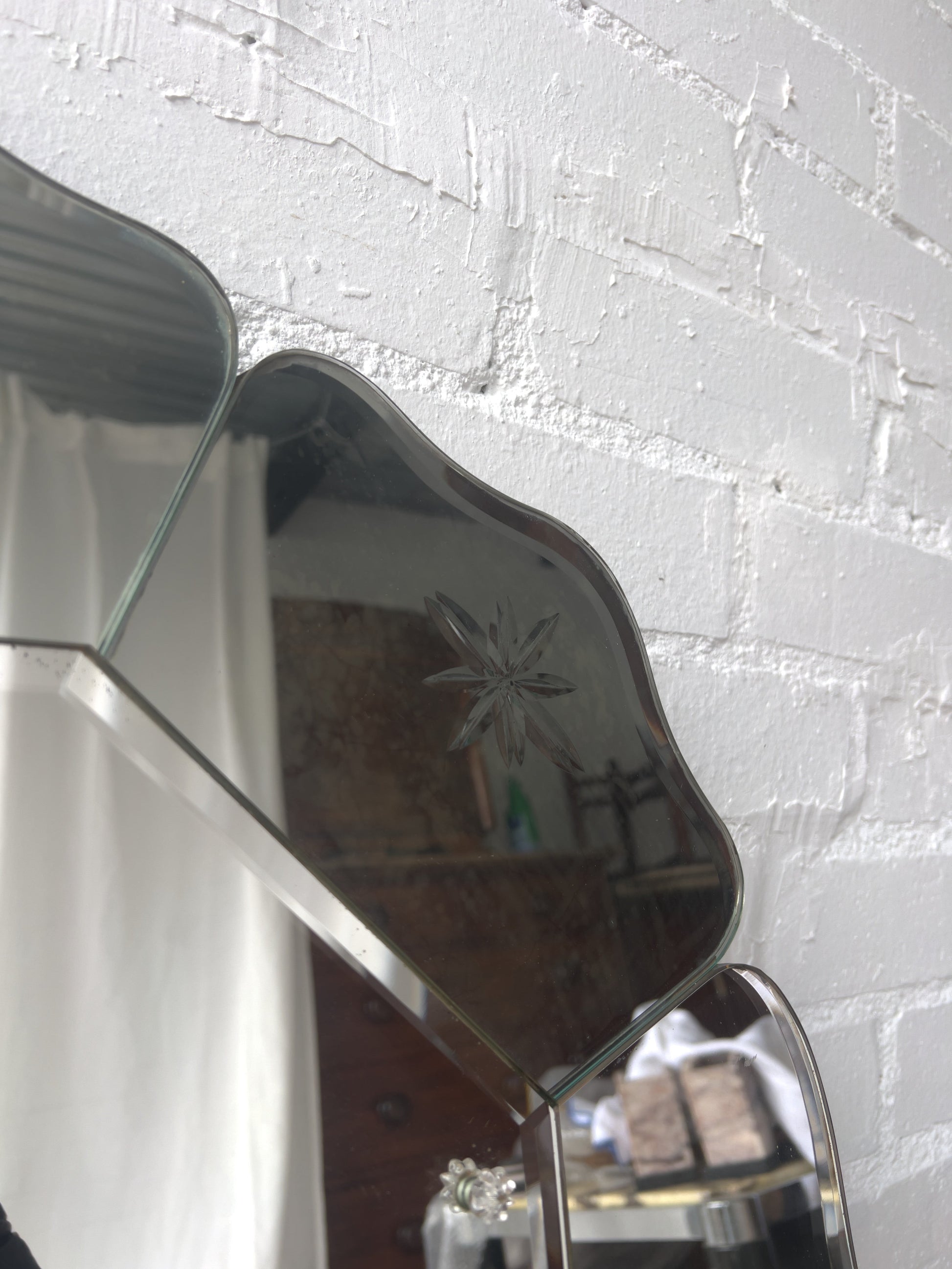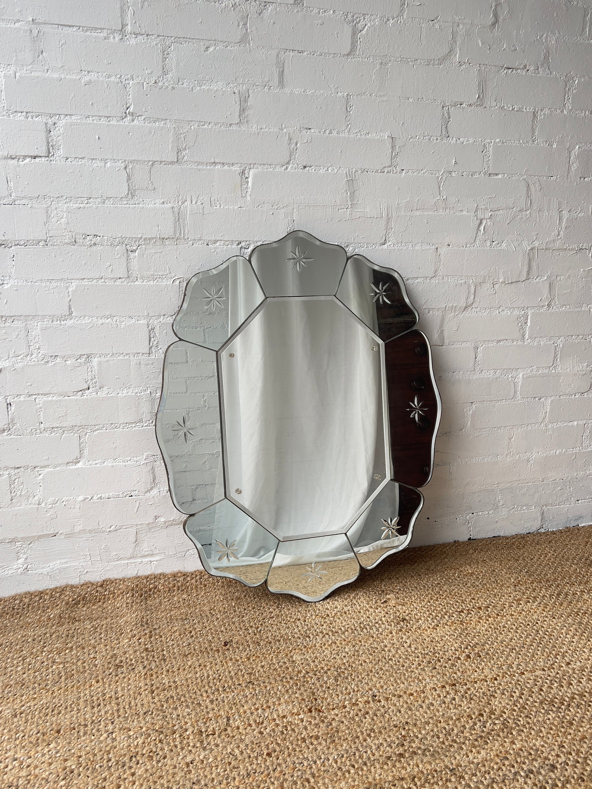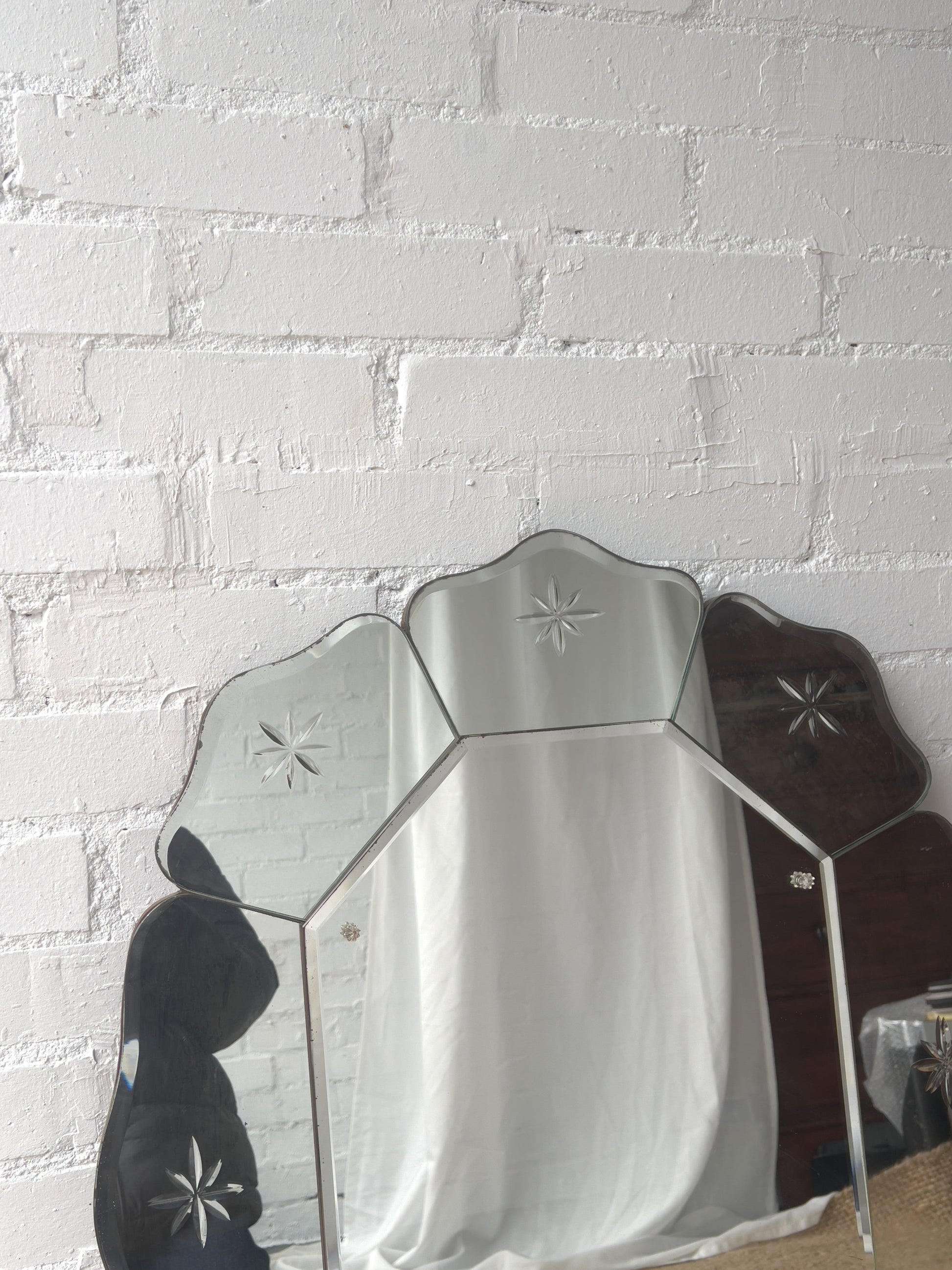 This large mirror has a scalloped-edge with multiple beveled sections forming a floral or petal-like shape. The outer sections feature delicate etched starburst patterns and smaller flower beads on the central mirror. Such a unique piece and would be a talking point within a room. Some foxing/ clouding on some of the sections but overall in great condition and this is ready to hang.