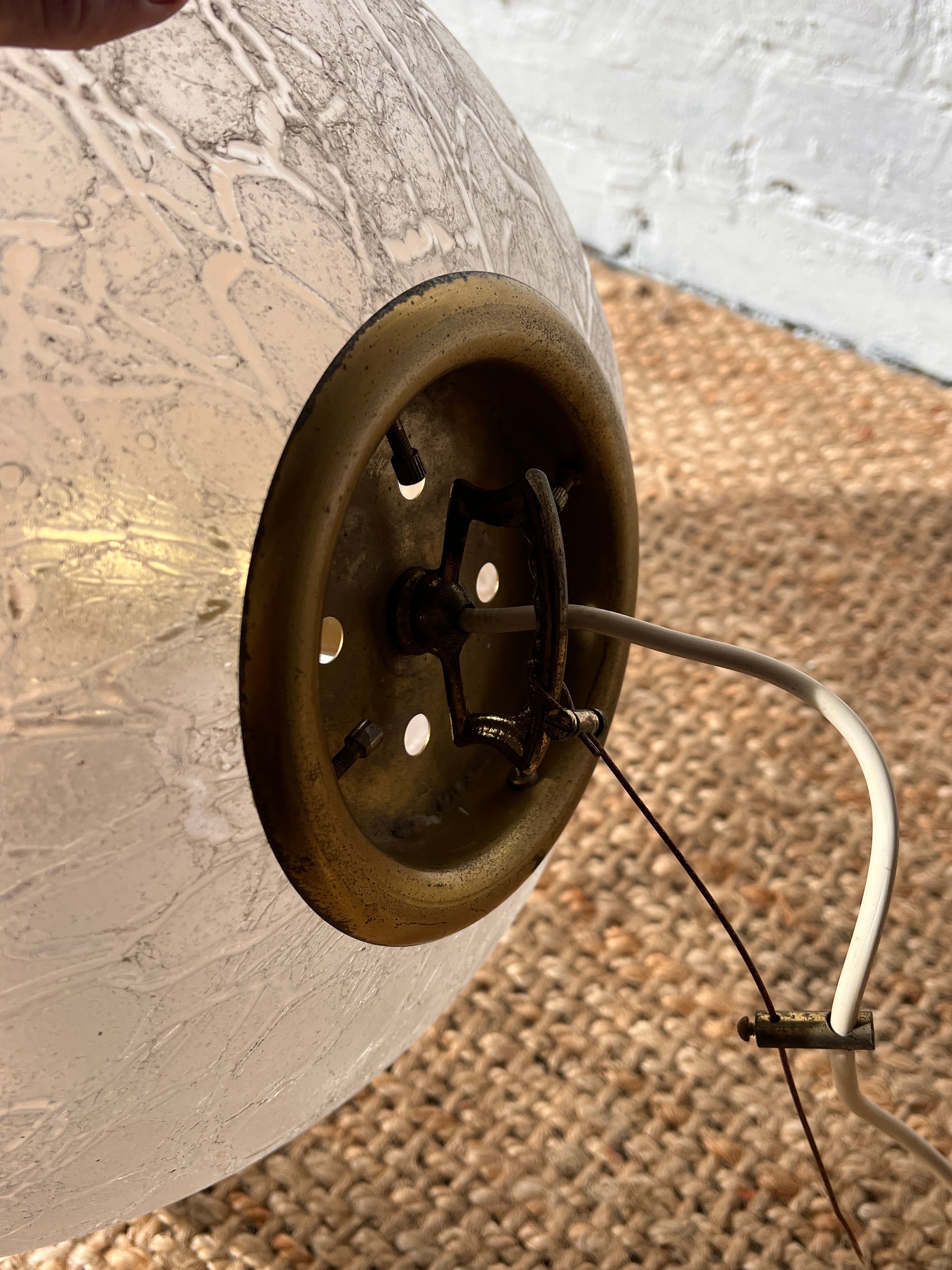 A stunning Italian ceiling pendant, dating back to the 70s. This is an excellent size to hang in a lounge or bedroom and would give off a gorgeous glow when lit. The piece has been hand blown and has a cracked effect across the glass, and the pendant comes with its original fittings. Some slight marks on the brass giving it character.