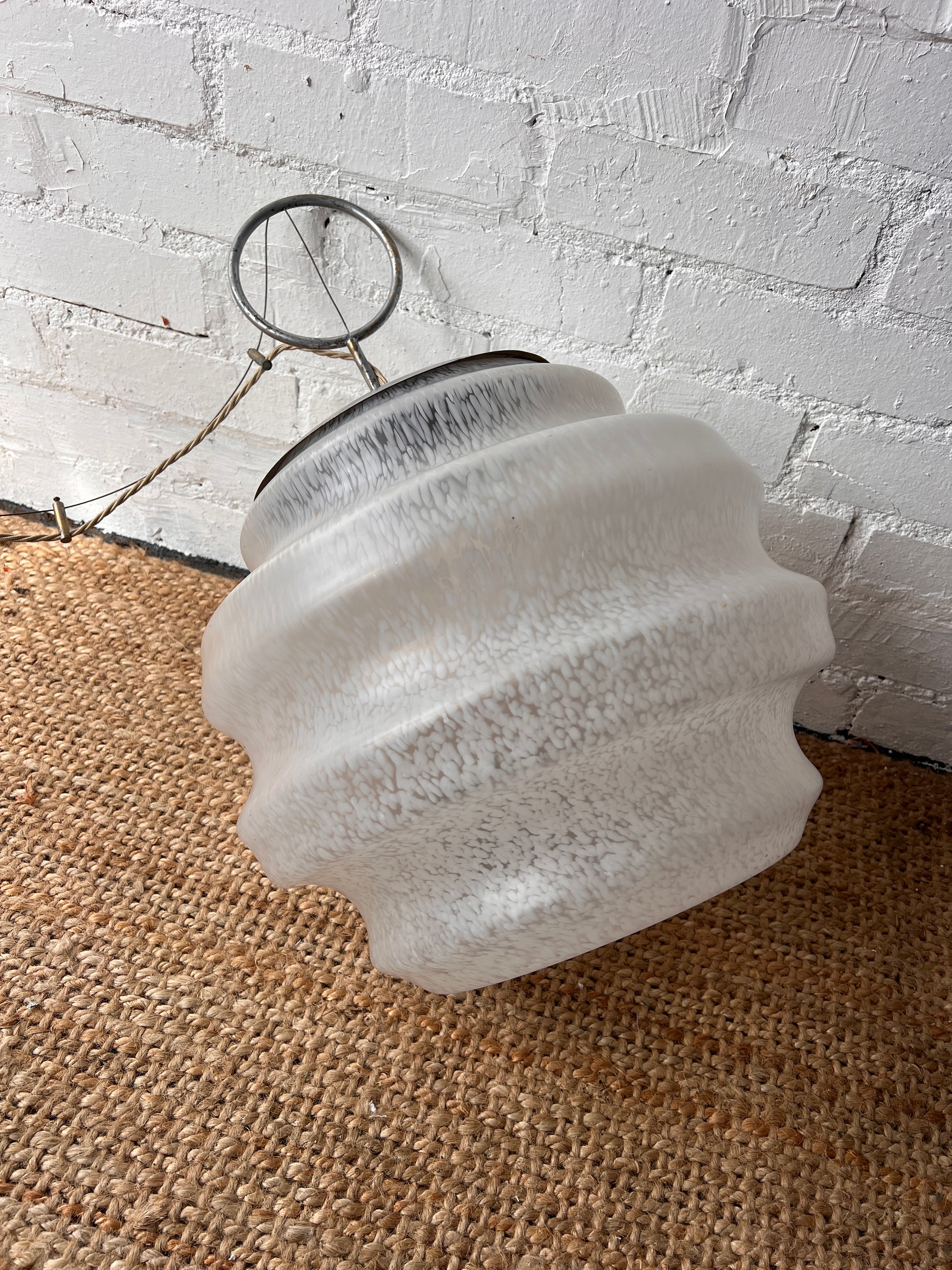 The pendant is suspended by a twisted flex cord attached to a circular metal loop and frame, which would connect to the ceiling fixture. There are some very faint marks on the glass as well as the chrome top & ceiling rose, see pictures, but i don't think this distracts from the beauty of the piece.