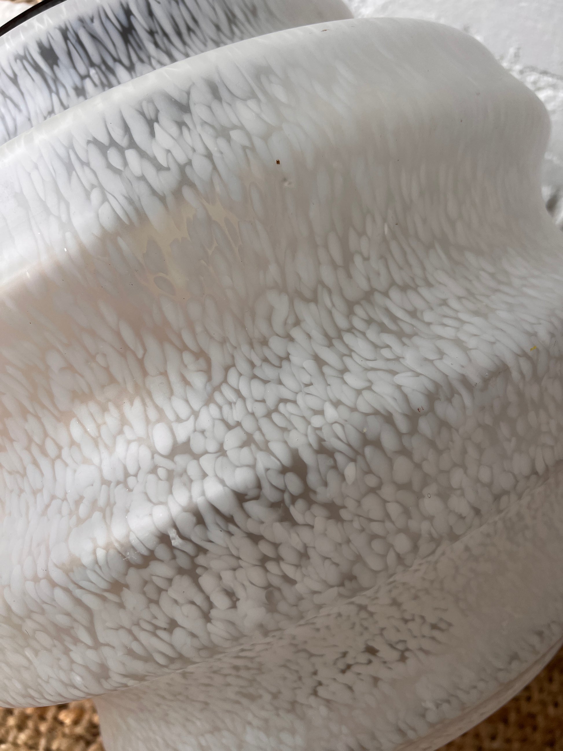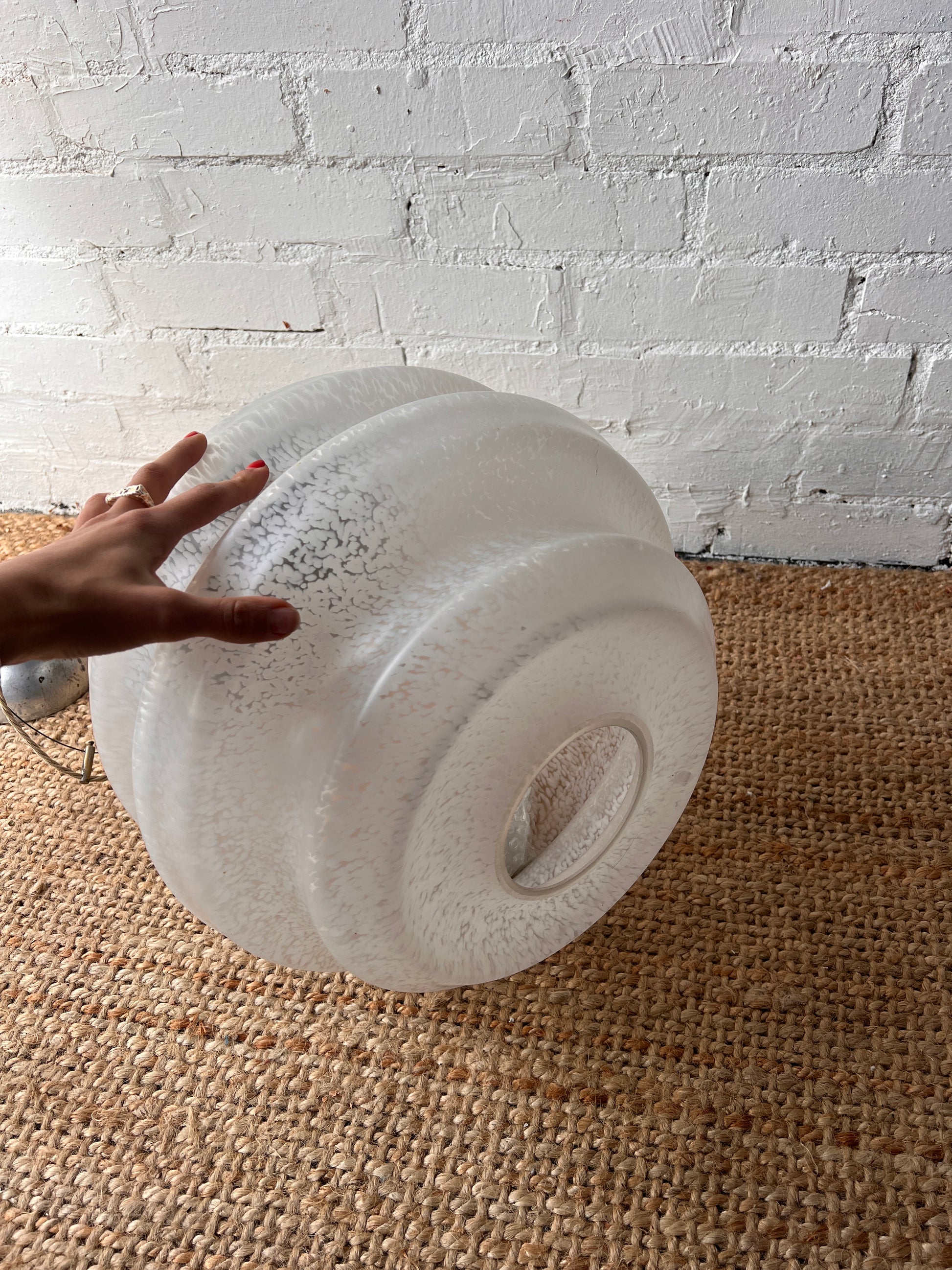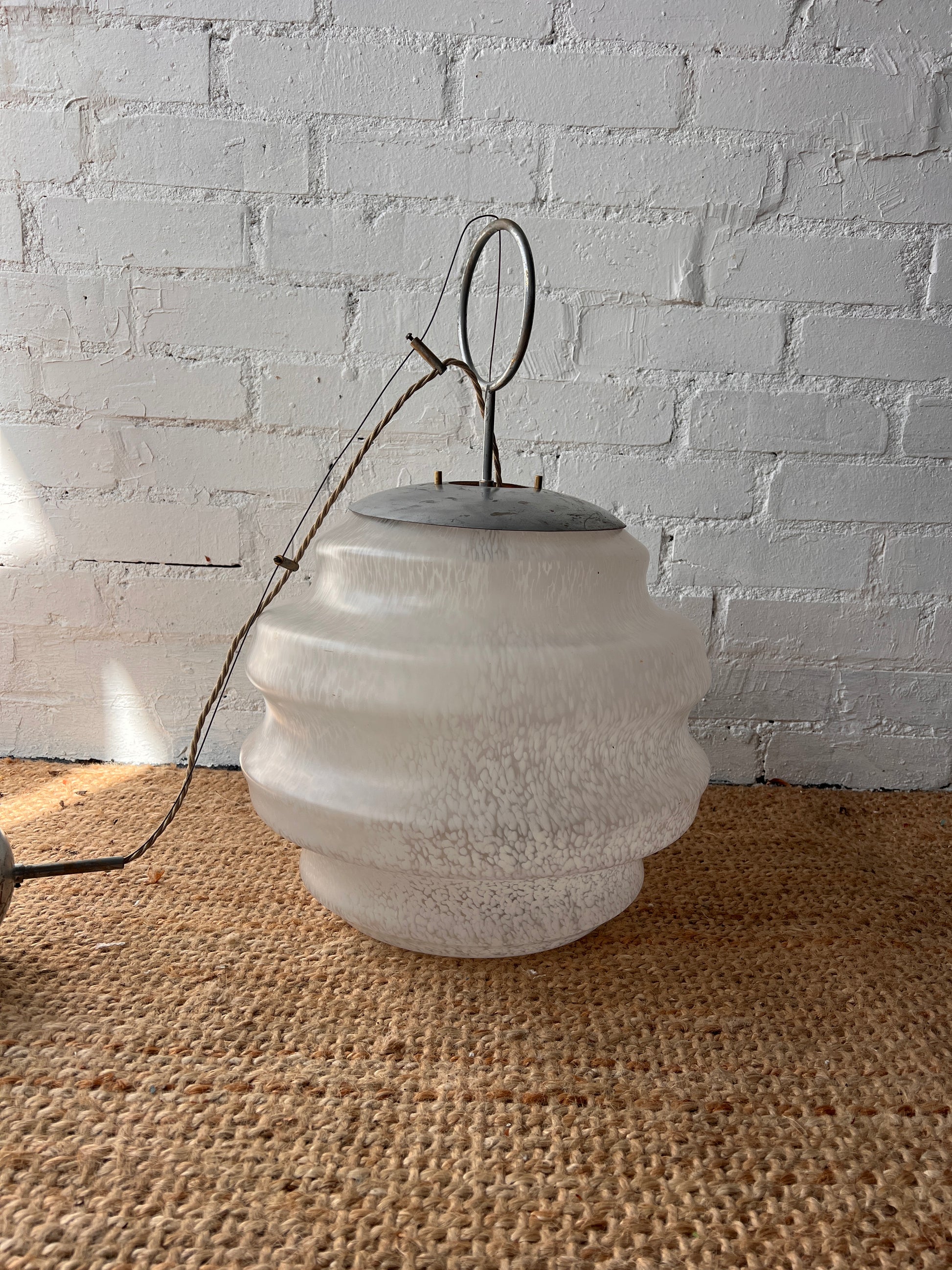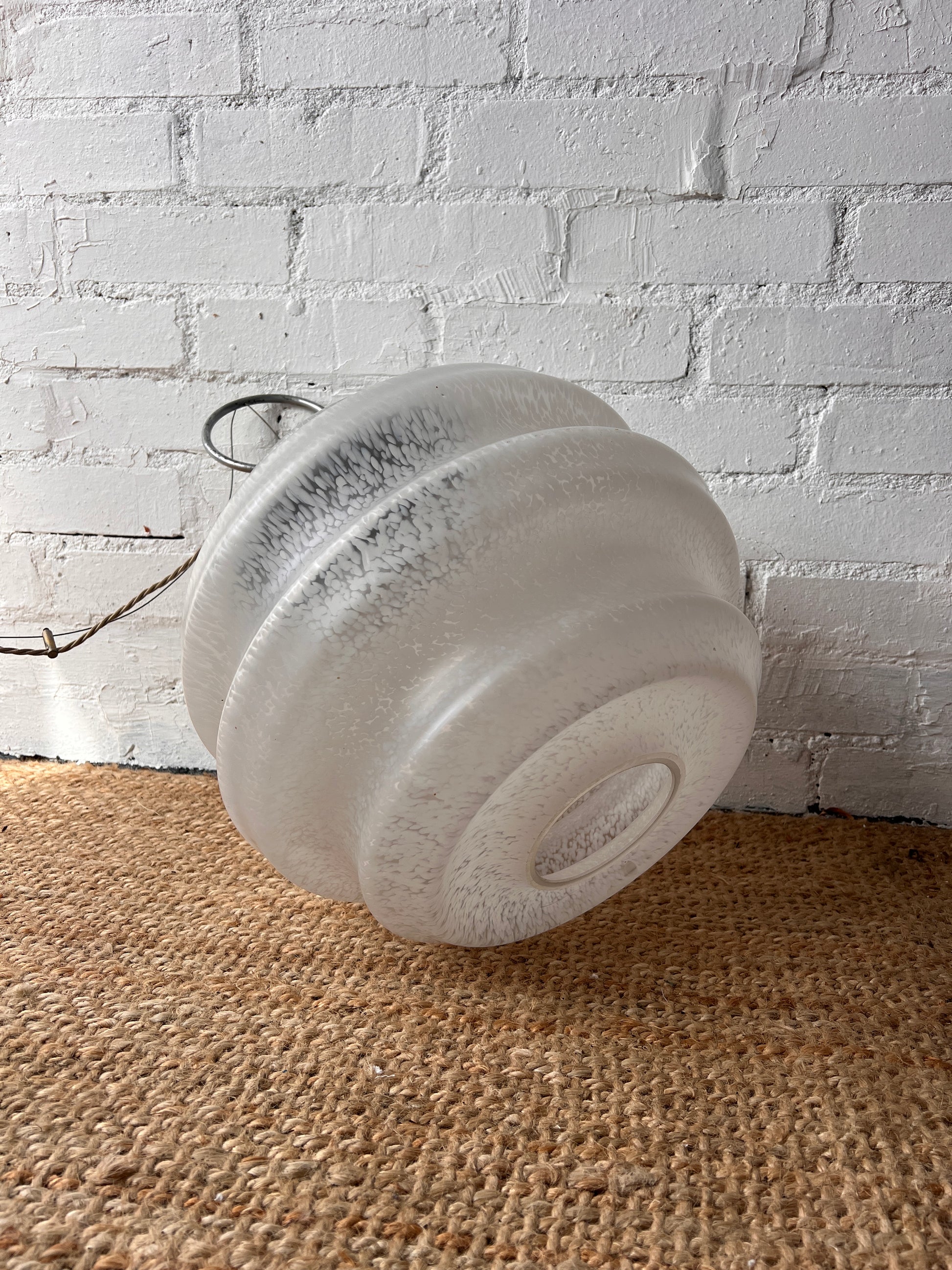 A large beehive style ceiling pendant made of glass with a chrome metal loop and ceiling fixture. The frosted glass is speckled & slightly marbled that would diffuse the light softly. Sourced from Italy, this is such a special piece and would look great hung at your desired length.