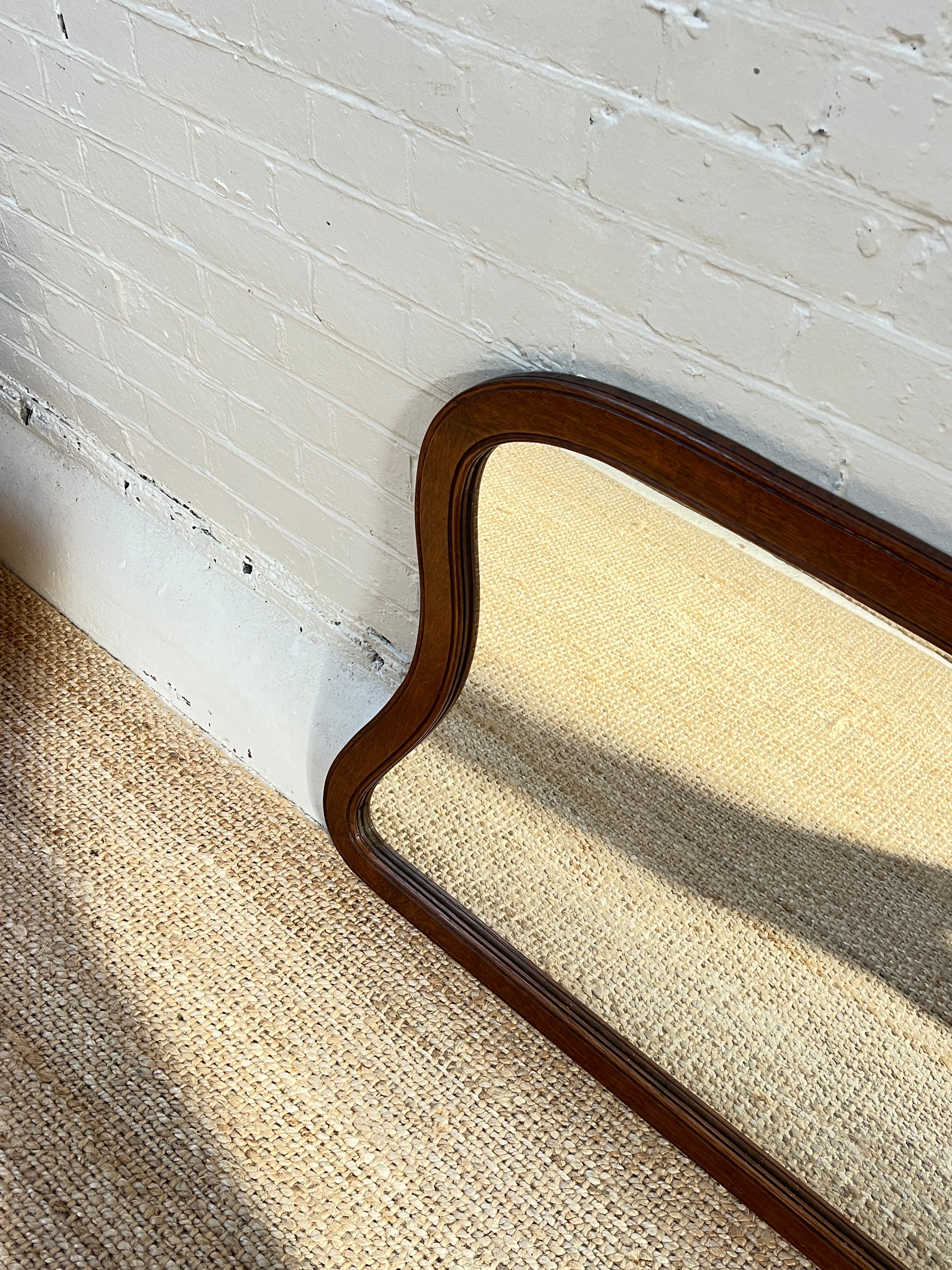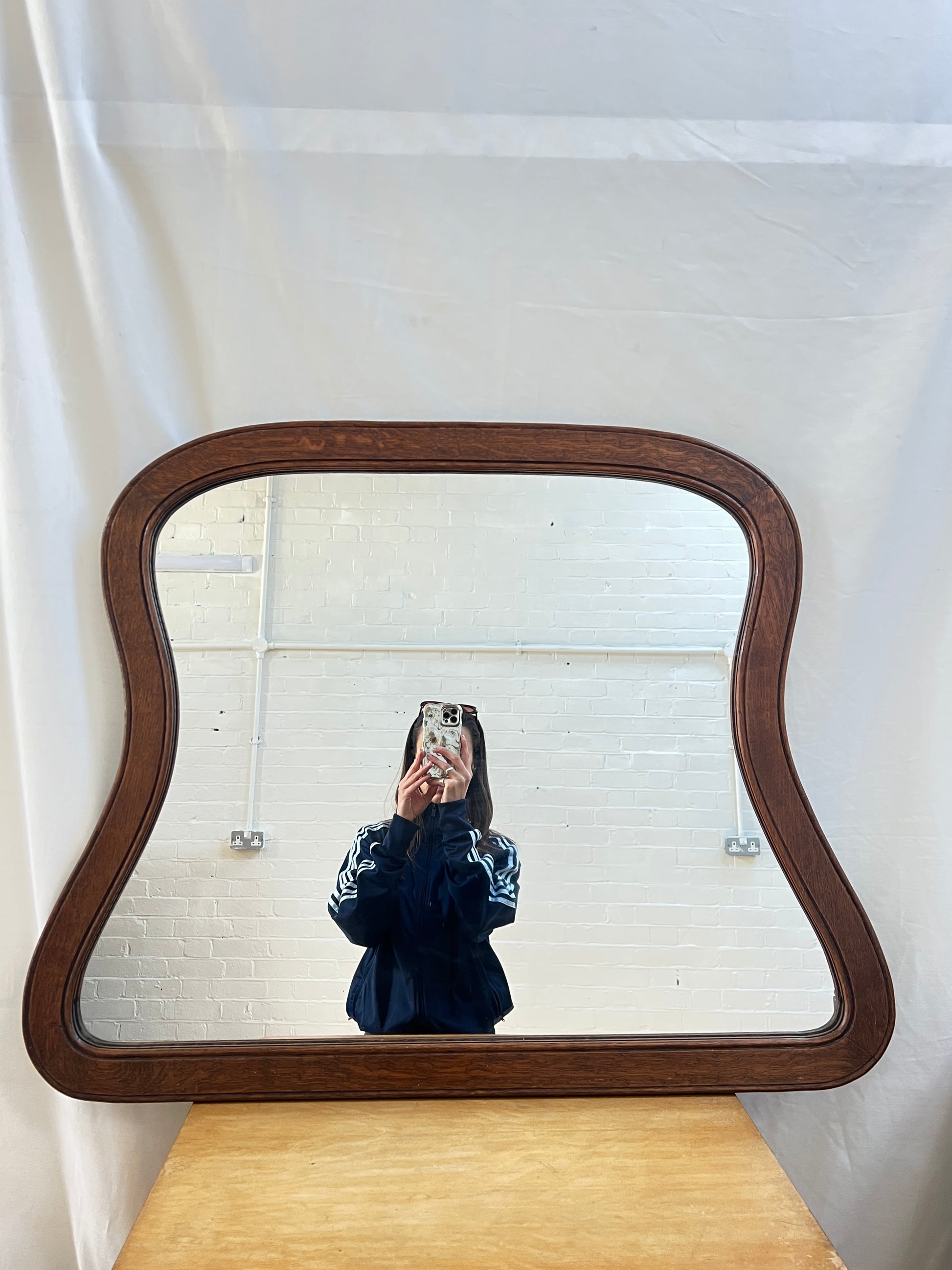 A wooden mirror which is great shape and size for a mantlepiece.The soft curves give the mirror a playful feel and whilst also feeling timeless. This piece is heavy so could be hung if desired. Sourced from France and in great vintage condition.