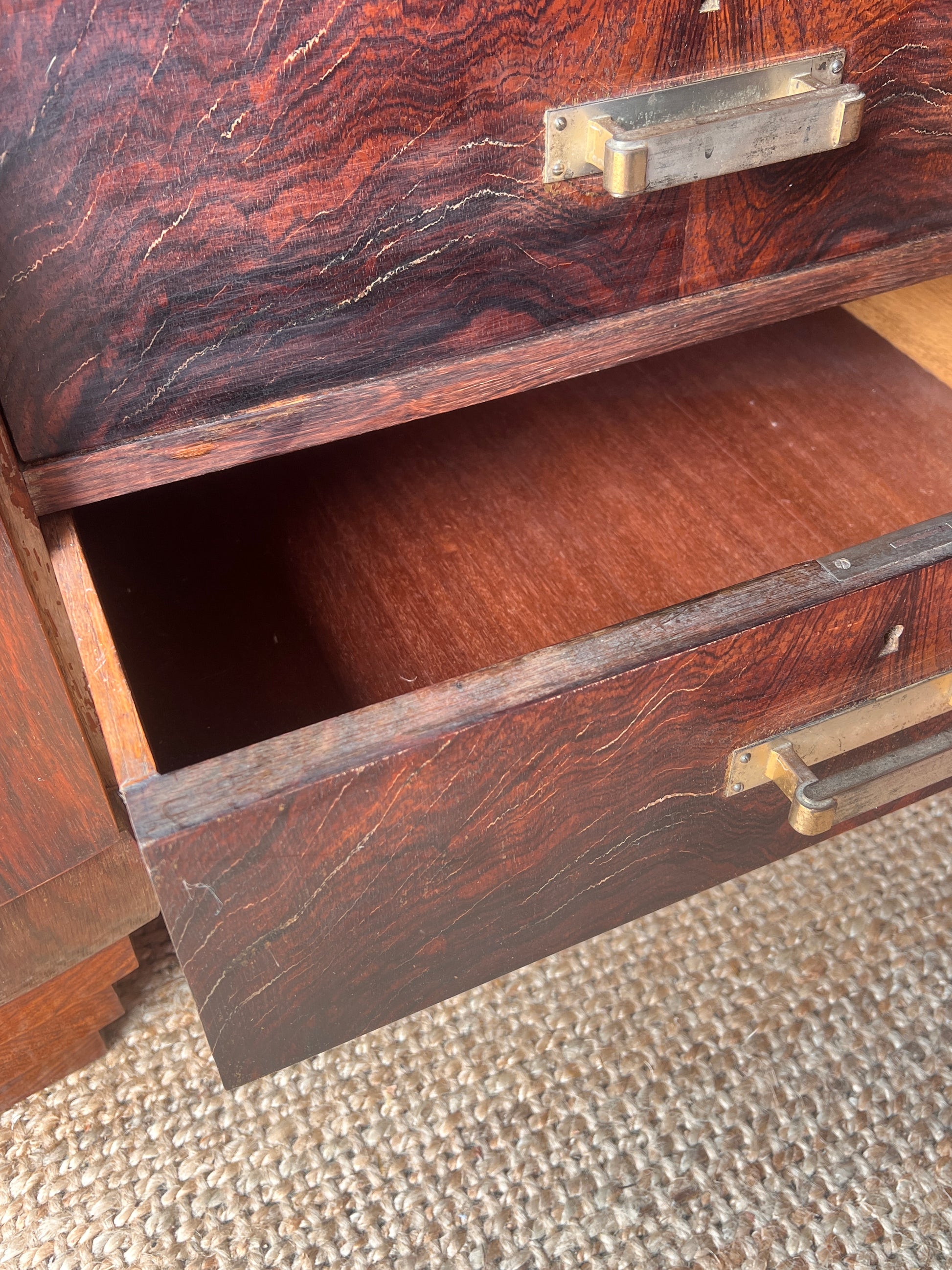which can be moved or removed if needed. There are four central drawers, making it perfect piece of storage. Circa 30-40s and sourced from Belgium. The top is removable for transport.