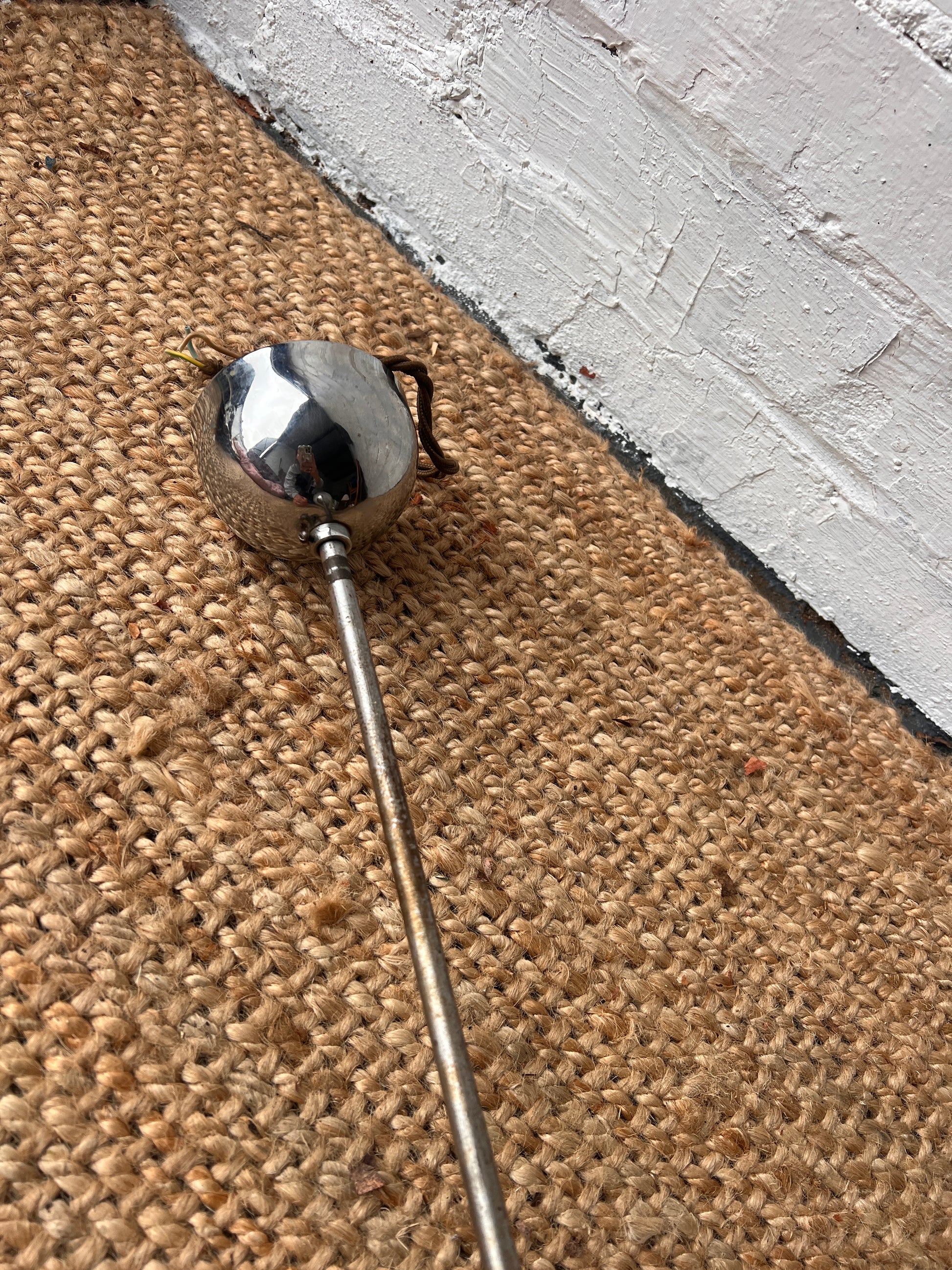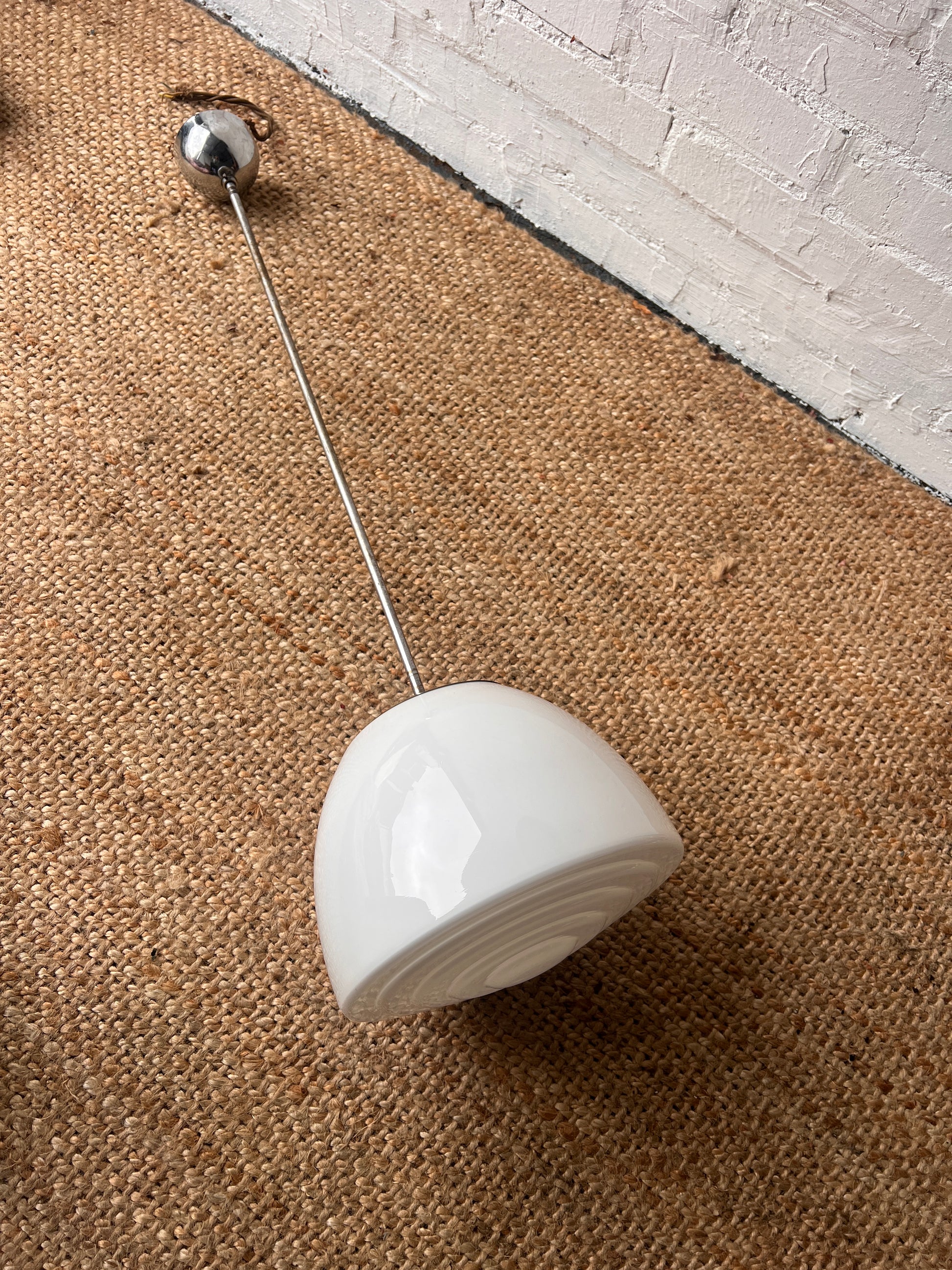 A mid century single milky glass ceiling pendant, with a chrome stem & rose. Some marks on the stem, but the glass is in really great condition and gives off a soft glow when lit. The glass has a glossy finish and has a  bowl-like form with concentric ridges adding texture and depth.