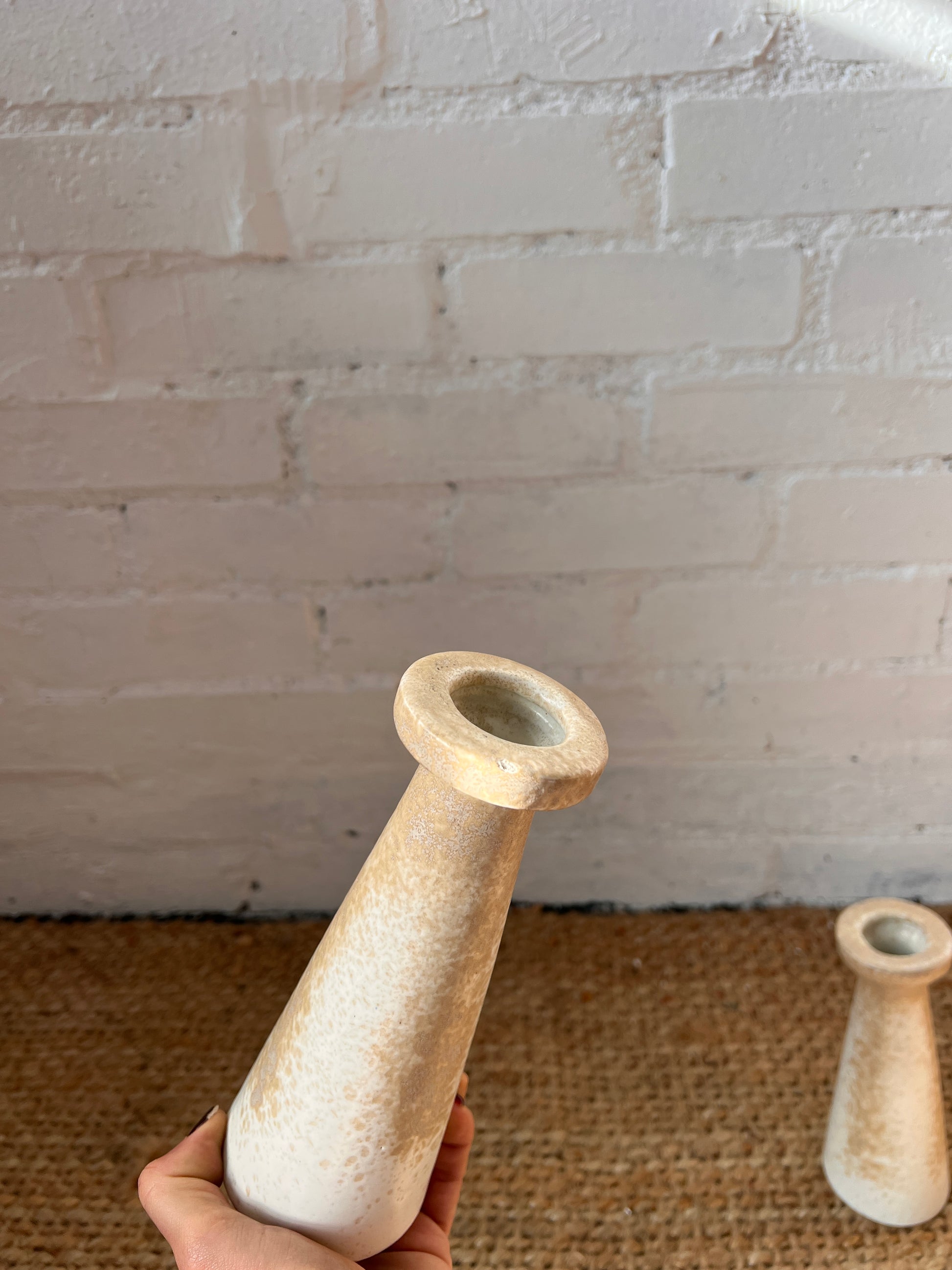 A pair of tapered cylindrical shape ceramic vase that could be used to styled flowers or as decorative pieces. The surface has a matte finish with a gradient of speckled beige and cream tones. There is a small chip on one of the vases, see last picture. Great condition considering there age!  I can see these on a mantle piece or part of a wider display.