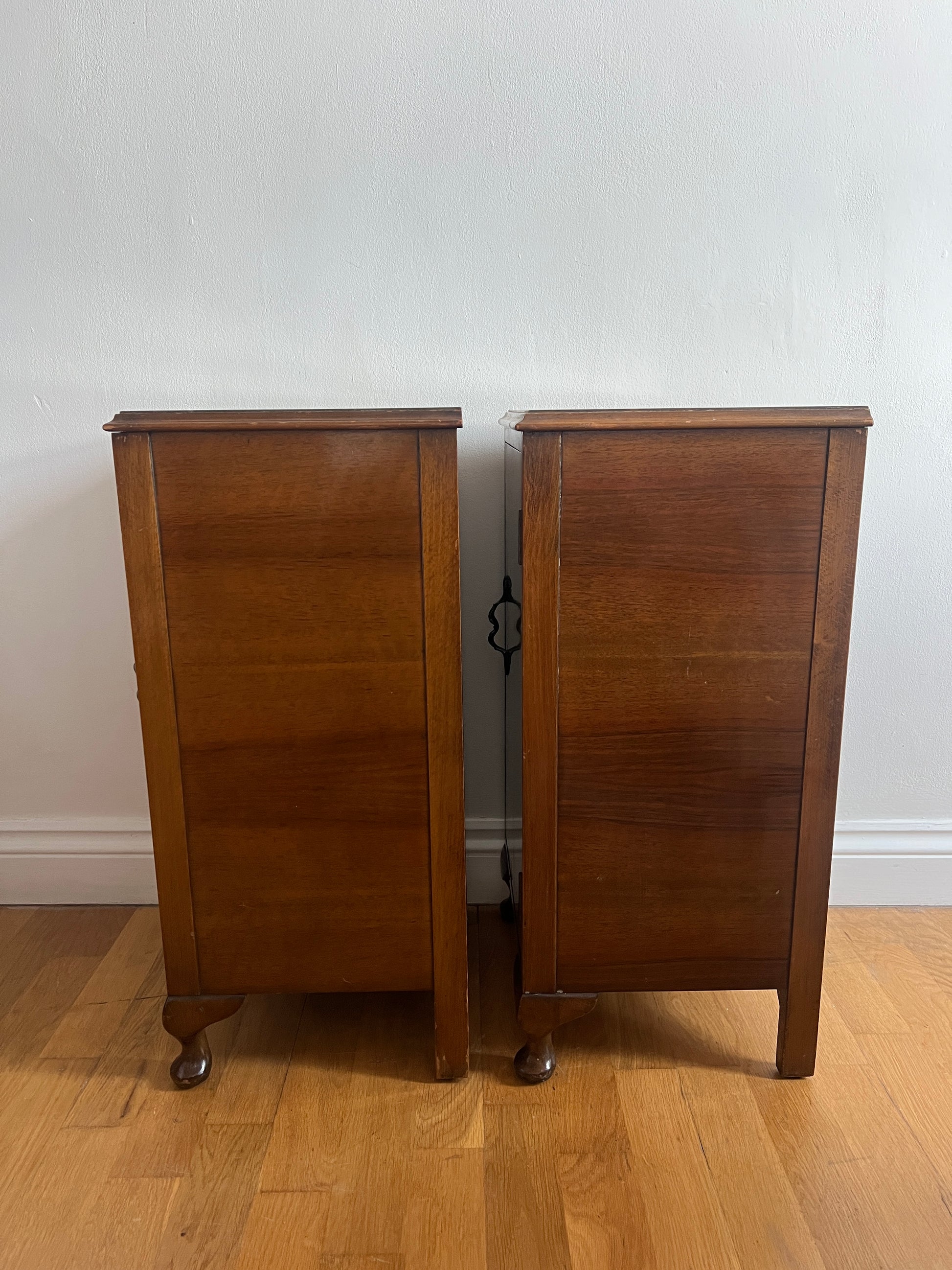 This pair of bedside are made of solid wood, on cabriole legs and have a walnut veneer. Both have detailed brass handles & great storage with a shelve inside. A few marks to report, see pictures but generally in good vintage condition considering their age.