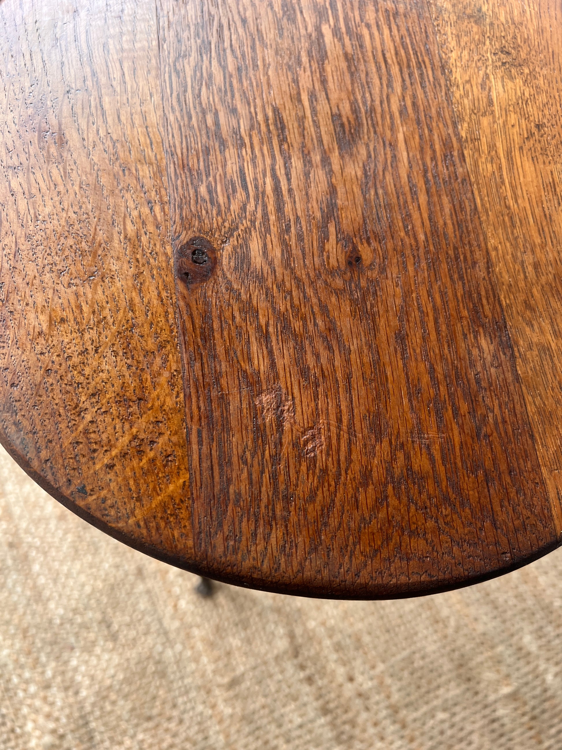A sturdy pair of twisted iron leg bar stools with thick circular solid wood tops - a perfect duo to sit under a bar in a kitchen. Sourced from France and in great vintage condition. Gorgeous patina on the wood.  Very small scuff on one of the tops, last image.
