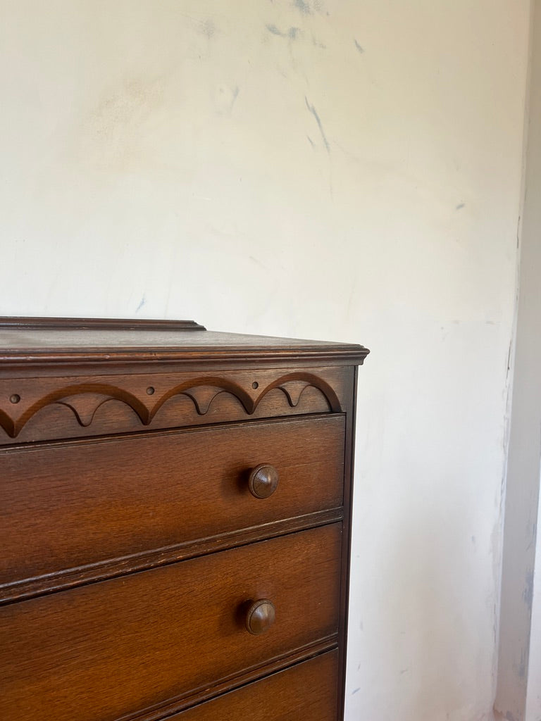 I sourced a similar chest to this in the summer so I was so pleased when I found another in a similar style! A great piece of storage offering five drawers, gradually getting larger at the bottom. The front has a scalloped / tear drop detail at the top, a very lovely decorative feature. Chests like these date back to the 40/50s and is made of solid wood. A few marks to the top and sides, due to their age but overall this is in really good vintage condition.