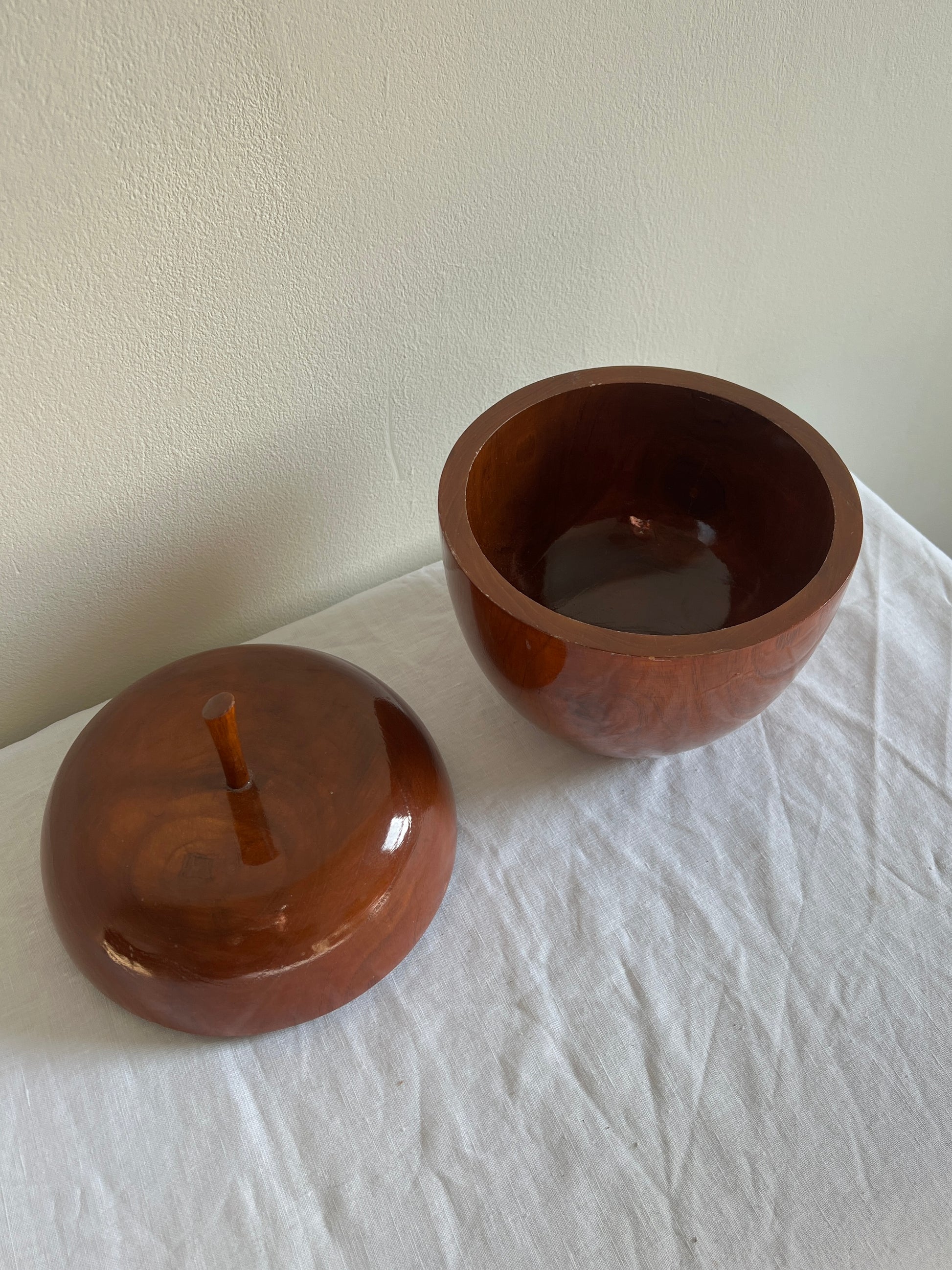 A large apple that has a lid and of made of wood. The shiny finish is in excellent condition. This piece dates back to the mid century and has been sourced from the UK. Excellent vintage condition.
