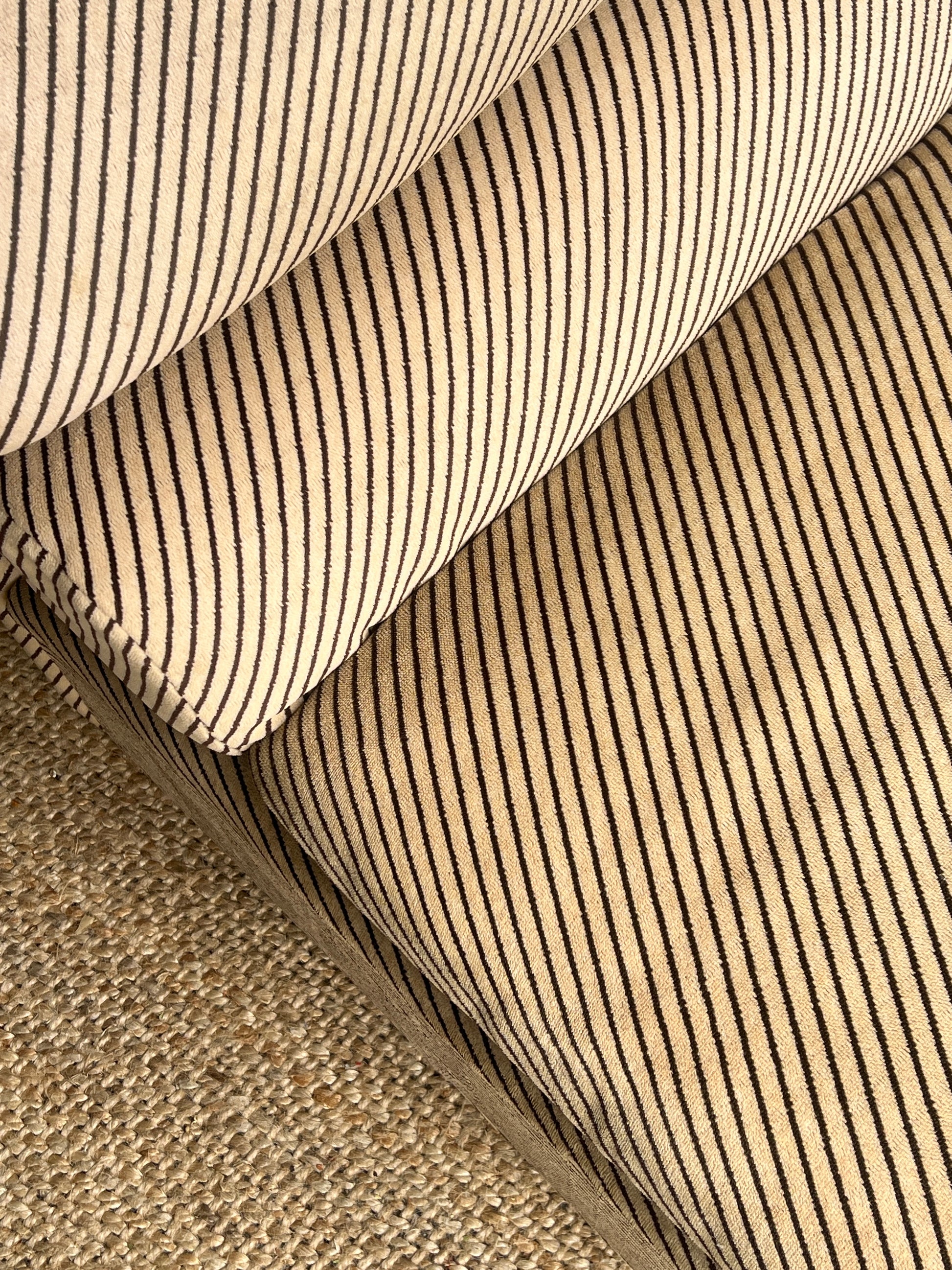 This modular arm chair has a beige & chocolate brown stripe that would look so fun in a living area. Sourced from Belgium, this has been cleaned and is in great condition. Very comfortable and is looking for a new home to spend the next chapter of its life. Dates back to the 70/80s. A few very faint darker patches from its previous use, but you wouldn't notice until you look close.
