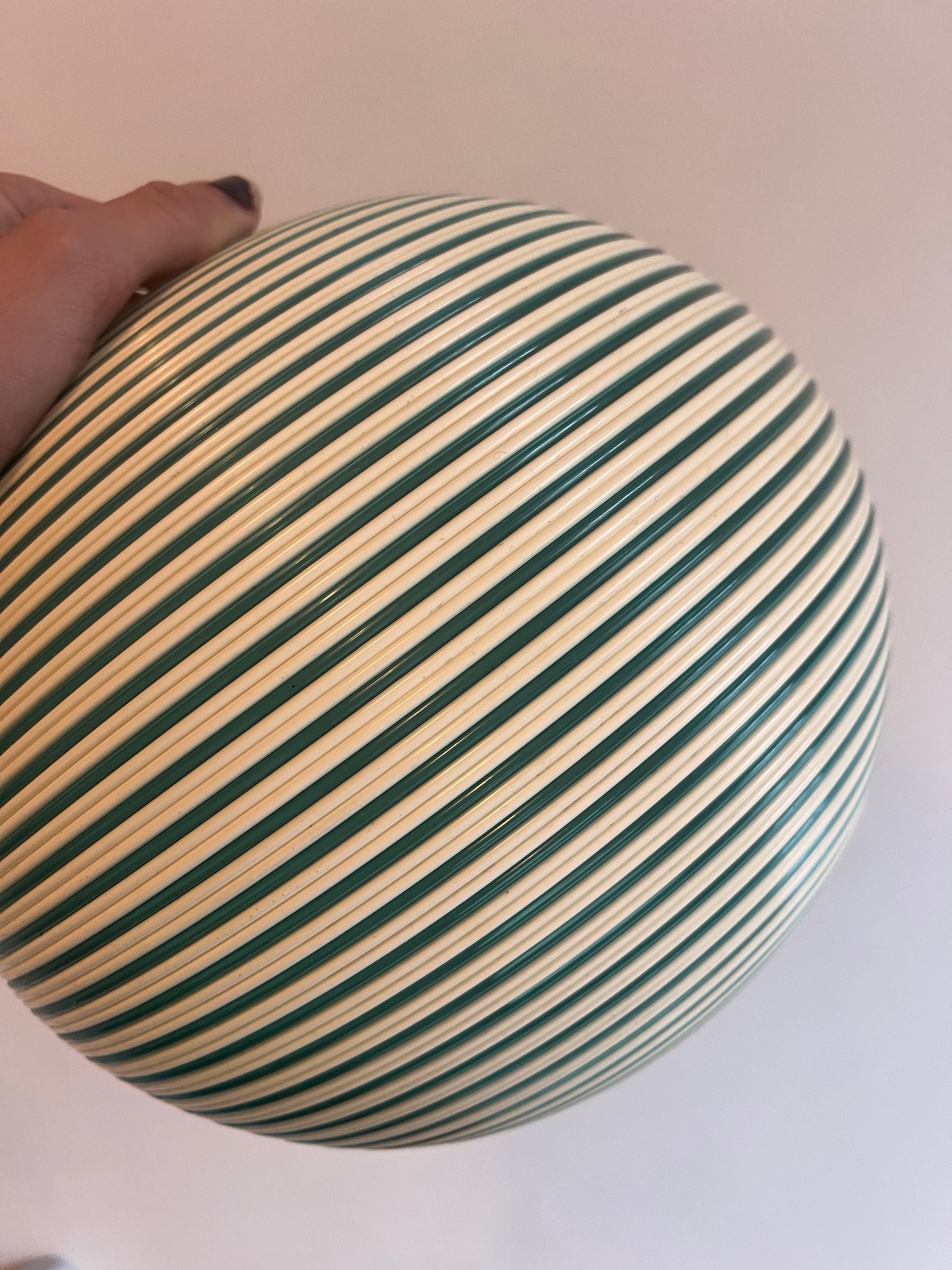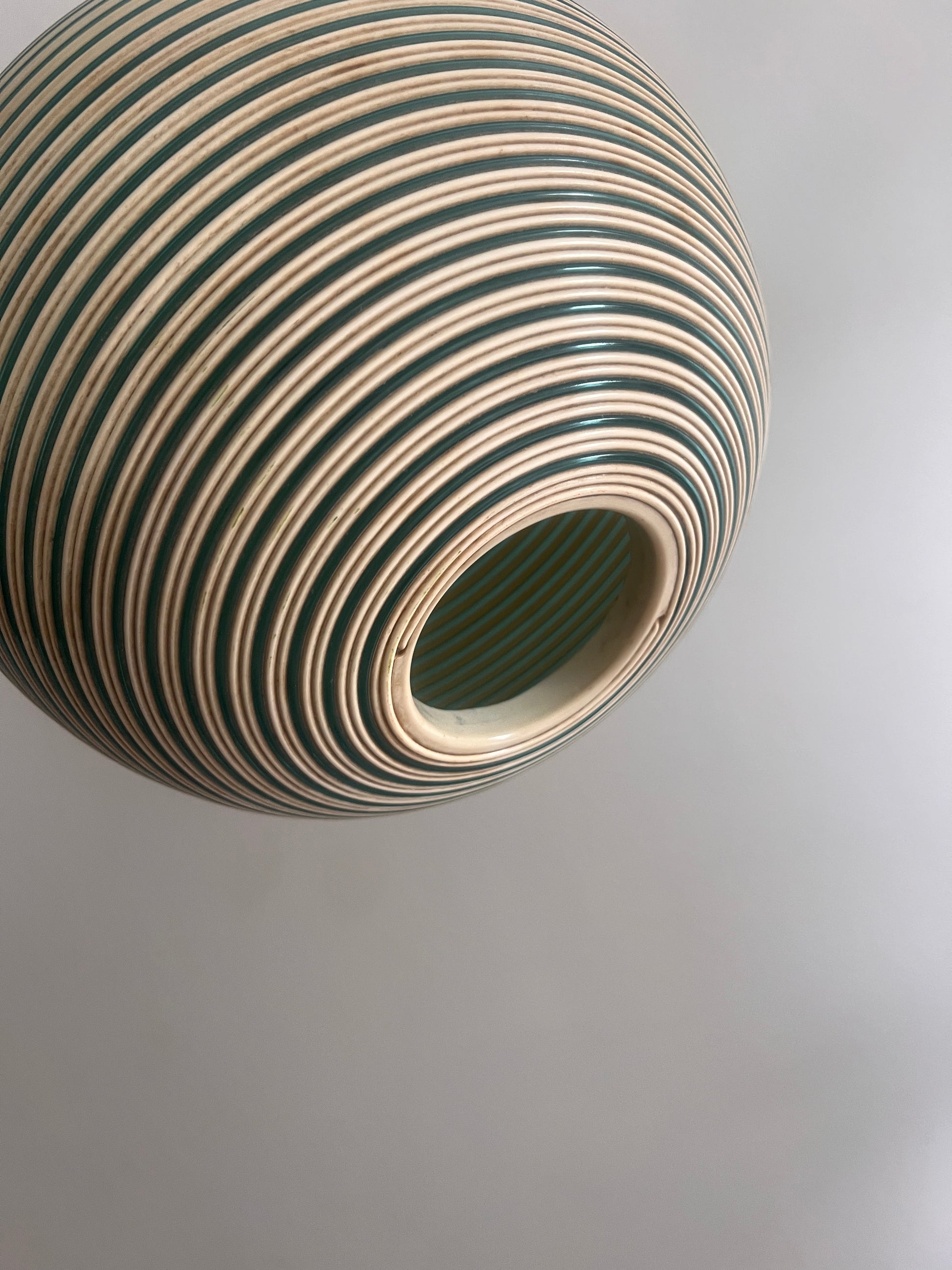 I sourced this striped globe pendant in Belgium, and I love it for its deep green and warm cream colour. Made of a type of plastic, this would be a fun addition to a space. The piece feels to be 70s and would look great in a space complimenting these colours.
