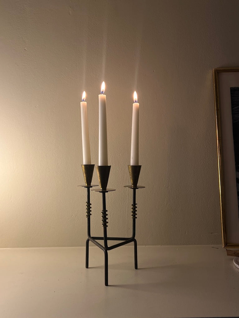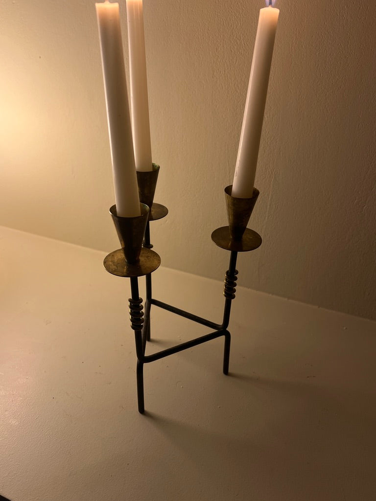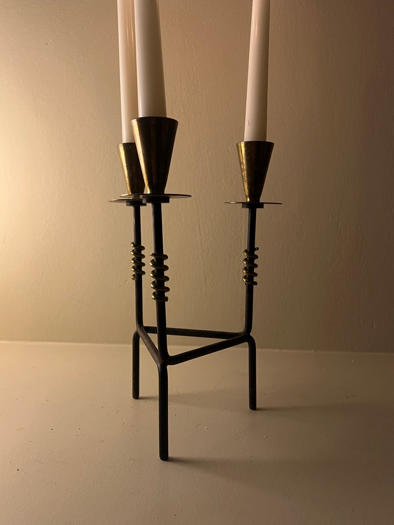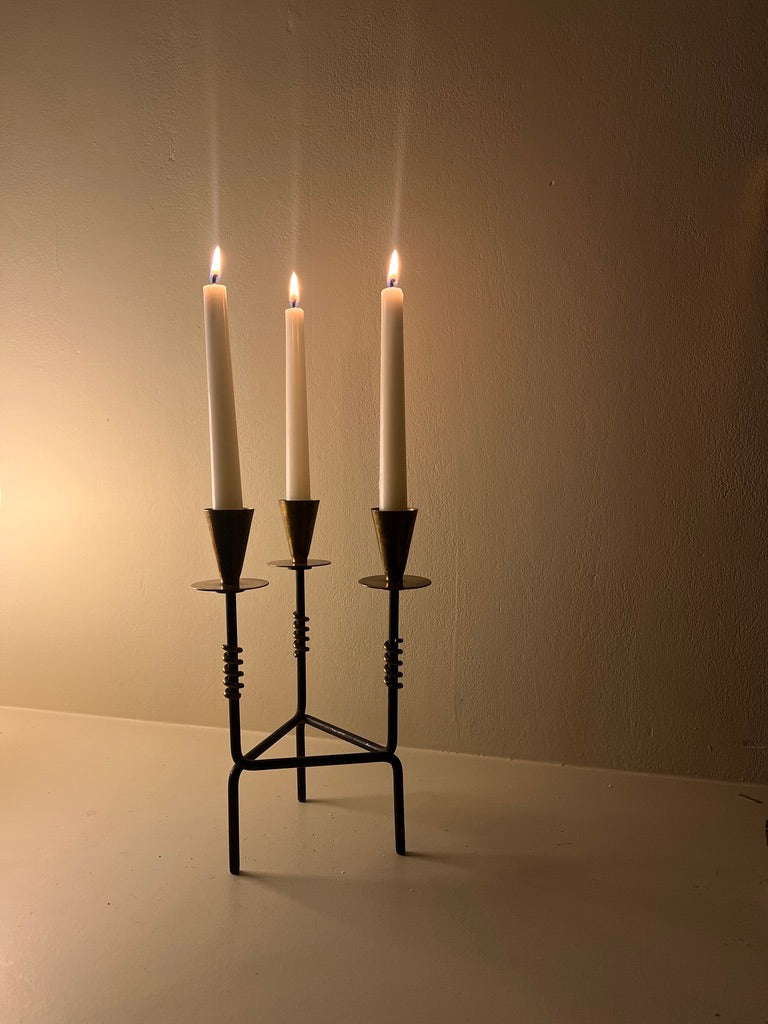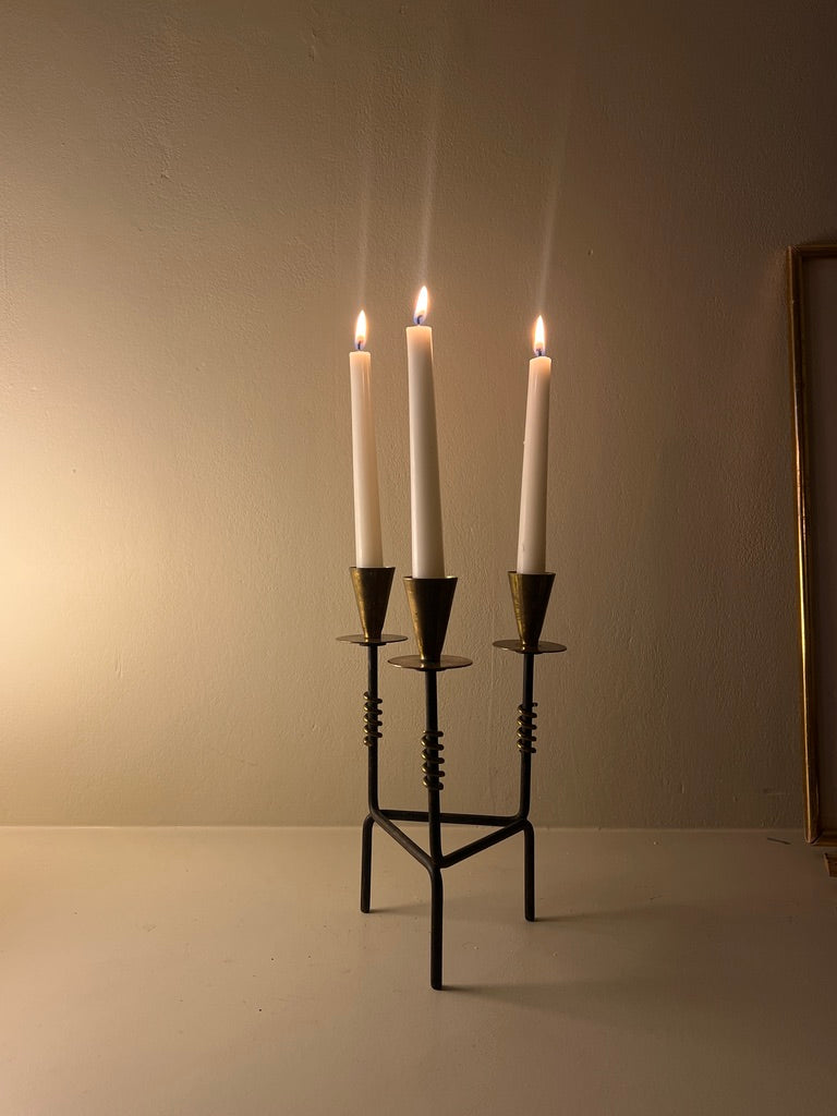 A gorgeous black lacquered metal tripod candle stick has subtle brass details and was designed by Nils Johan in Sweden in the 70s. These hold 1.2cm tapered candles and to be cut down slightly so they sit securely in place. Good vintage condition.