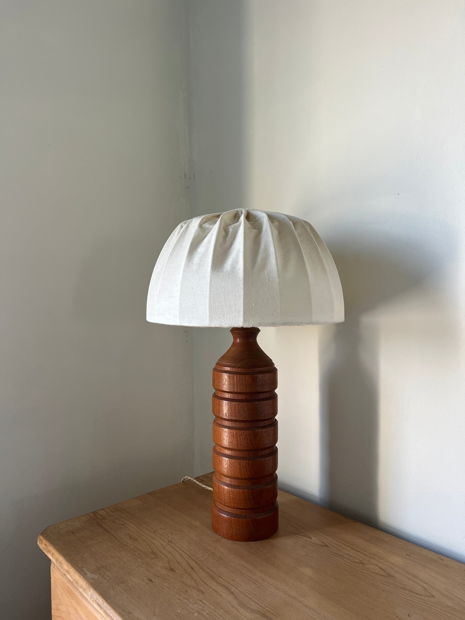 A tall good sized wooden table lamp with a dome shade. The base is made of wood that features a series of stacked, rounded sections with grooves showing the texture of the wood. The fabric shade is in good condition with a small mark, but not noticeable until you look close. Has been fitted with a beige twisted flex, fits a bayonet bulb and has a UK plug.