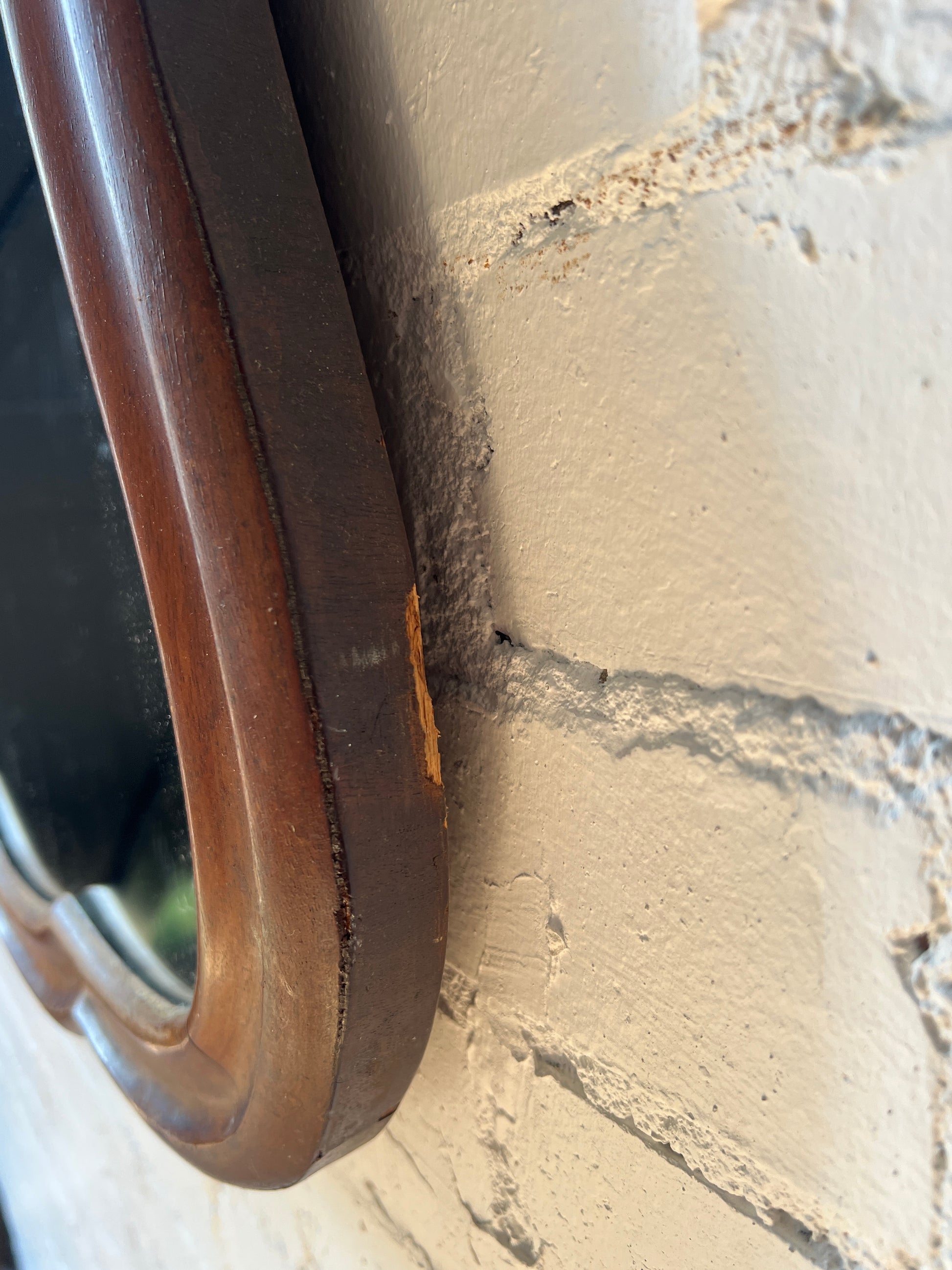 The mirror has been replaced so is in excellent condition.  Two side brass brackets which remain from its previous use and a slight chip on the back but wouldn’t be seen when hung. Some slight wear on the wood but this is expected with a vintage piece.