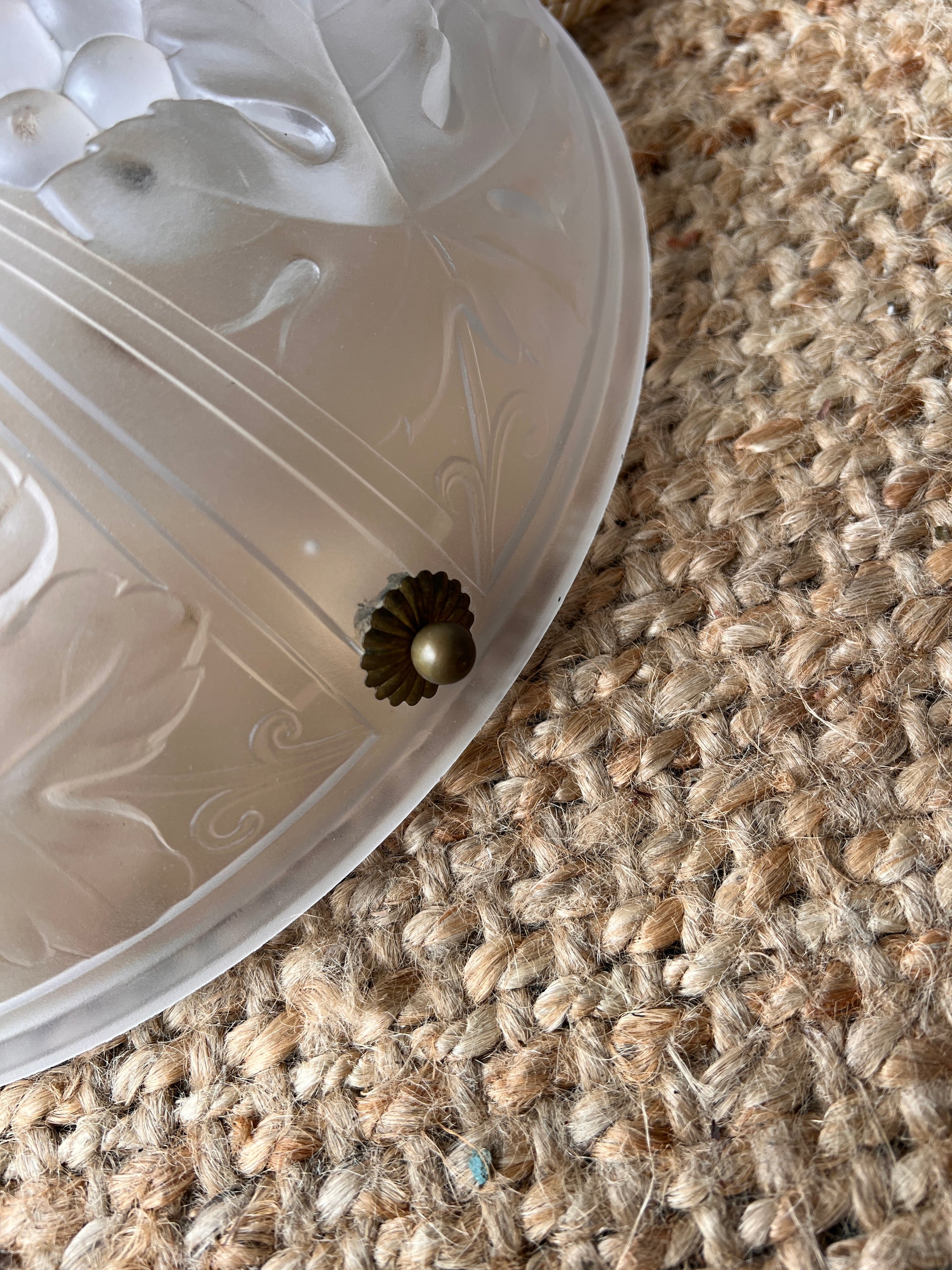 A white glass ceiling pendant, sourced and made in France, with a brass ceiling rose. This would look lovely hung in a hallway. The glass has a floral design with the glass featuring grapes and leaves. The glass has brass floral decorations around the edge, with some minor marks around flowers, however these do not indicate any cracks or damage to the glass itself.