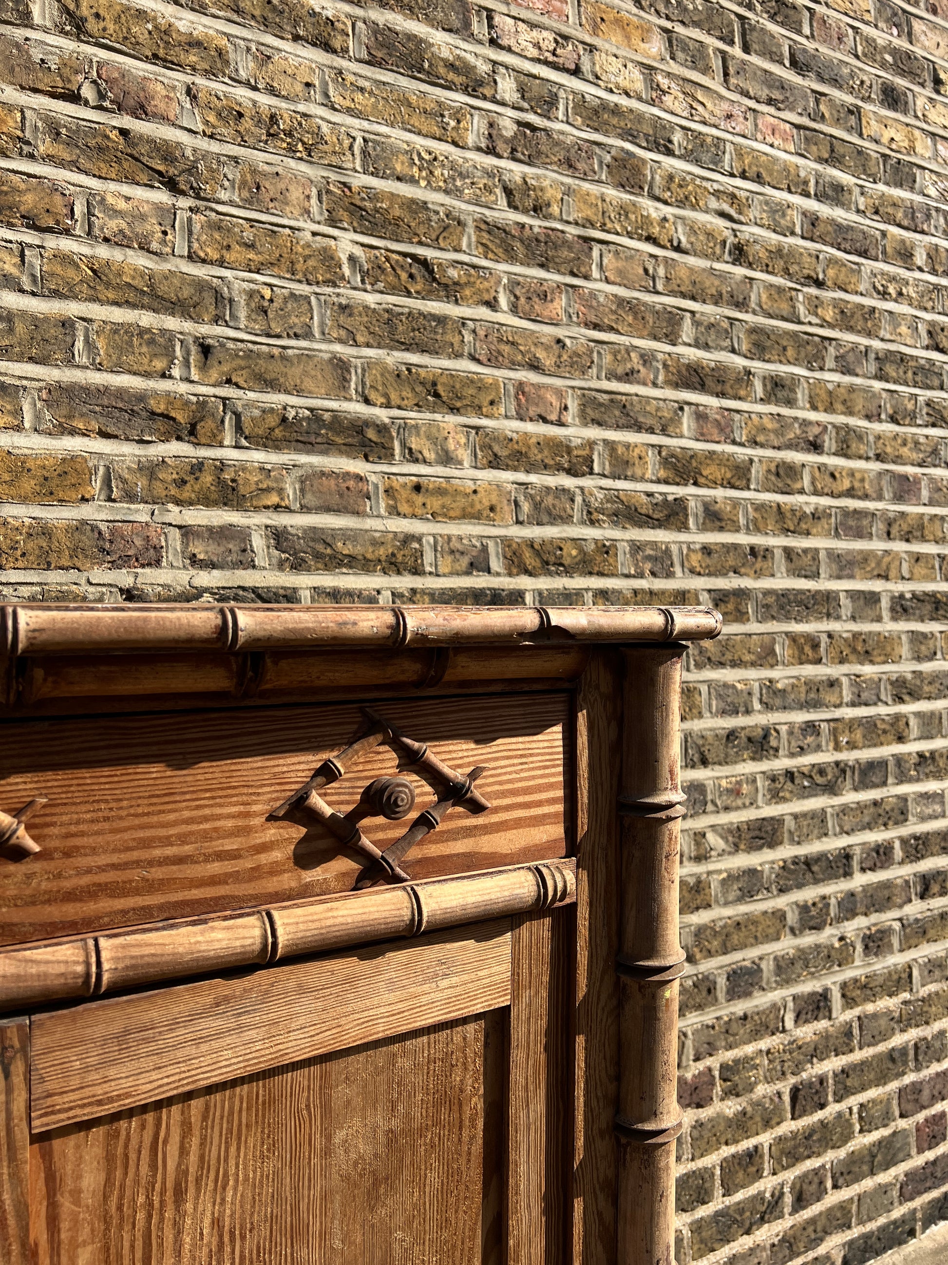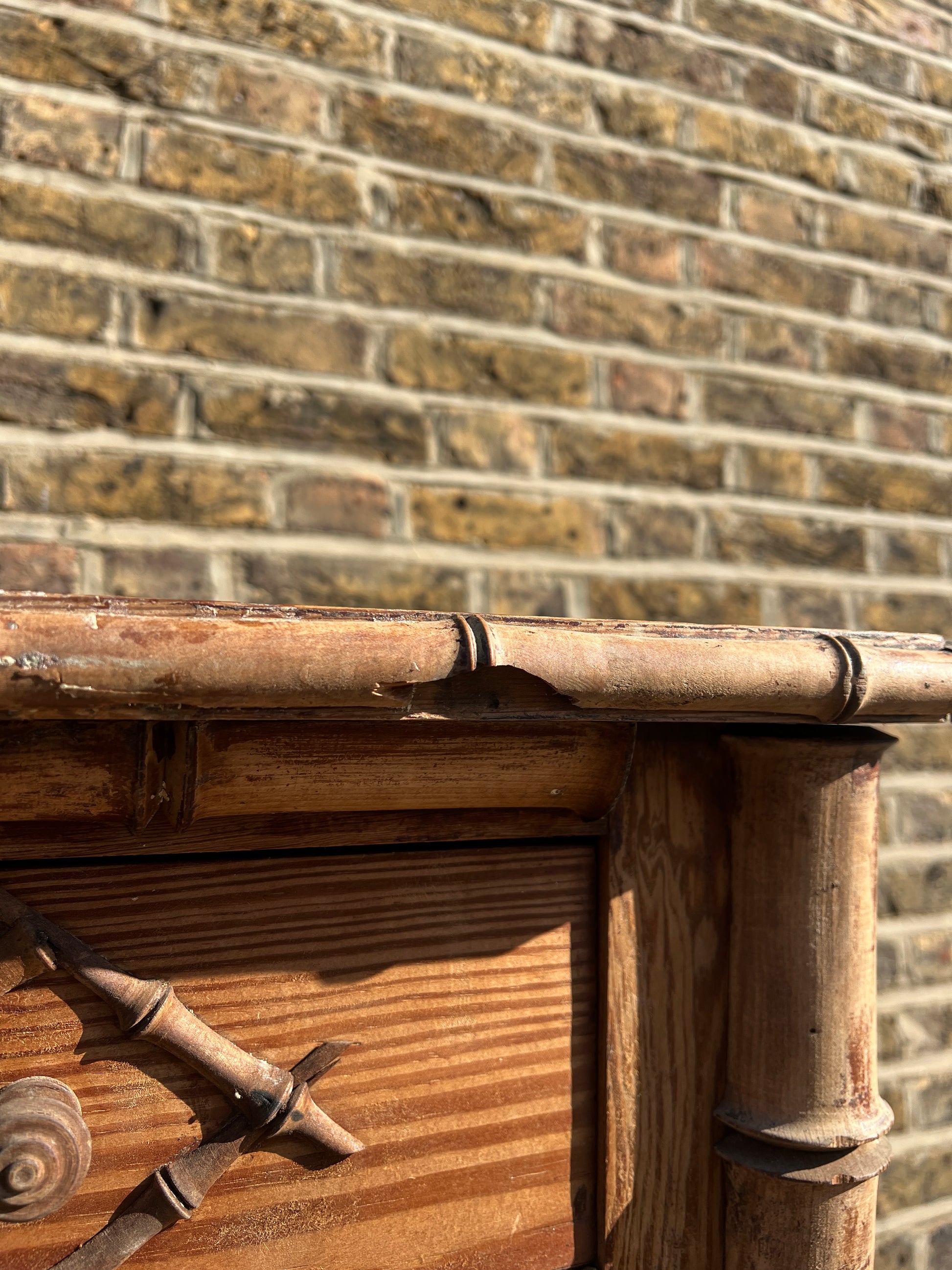 A large wooden French bamboo cabinet, with double doors and faux bamboo, carved from wood, detailing. This would look great in an alcove and has heaps of storage including shelves inside and a top drawer. You can't come across these pieces too often!