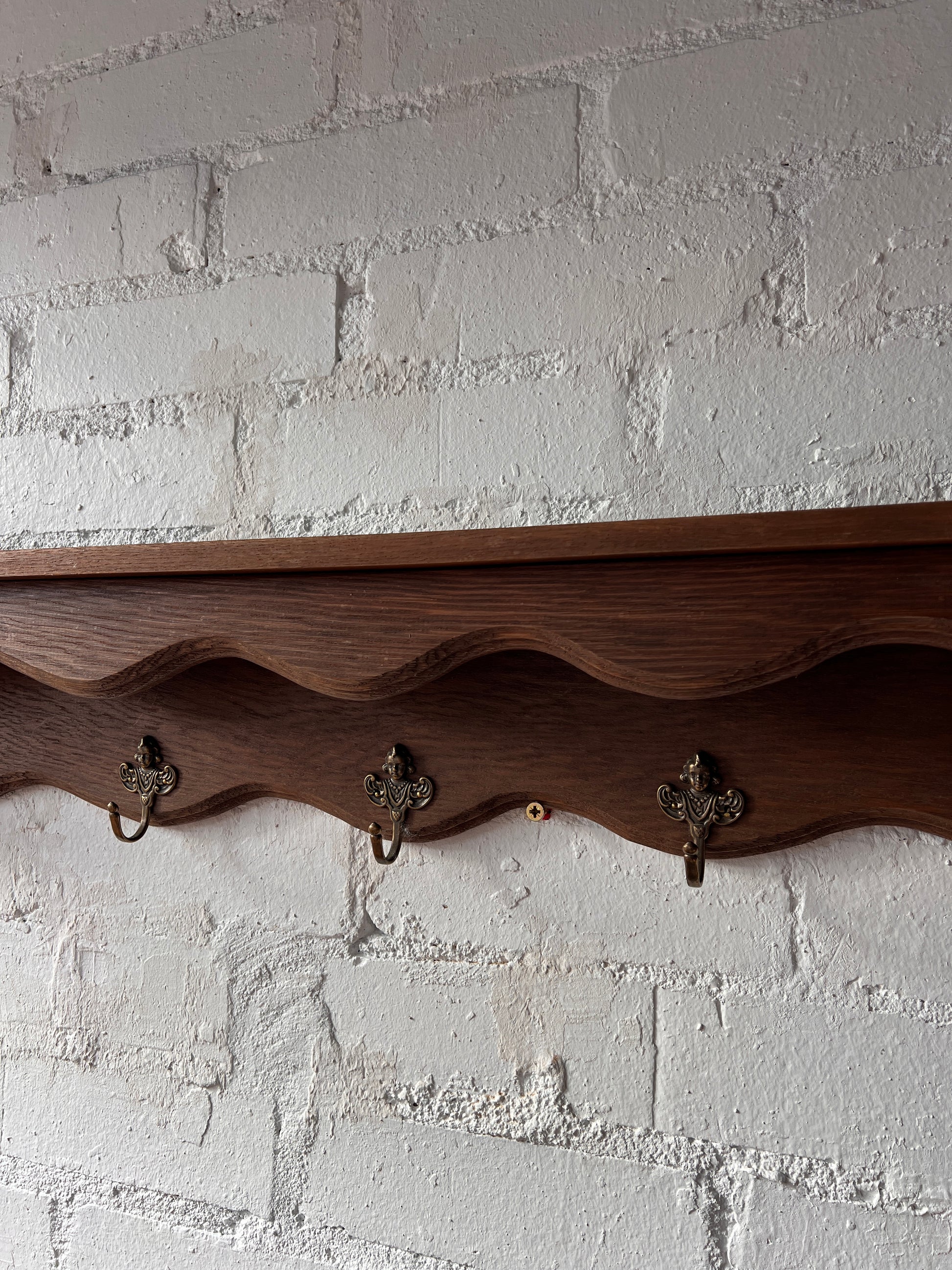 a wooden with wall shelf with a scalloped edges and five cherub brass hooks — perfect for a hallway or even a kitchen. Great vintage condition.